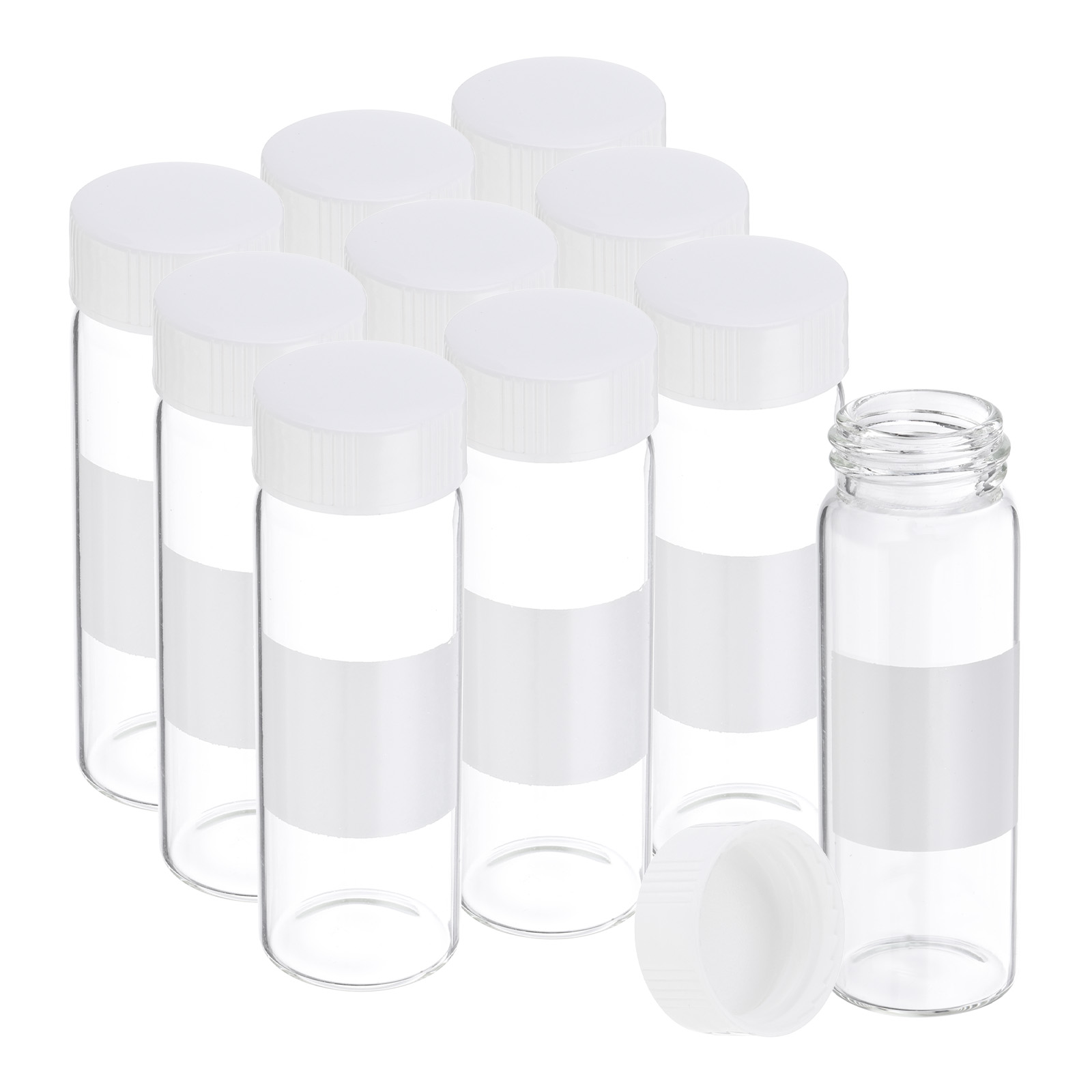 PATIKIL 10個の30mlの小さなクリアガラスビアル 白いねじキャップ付き ホウケイ酸ガラスサンプルボトル 固体液体粉末の保管用ラベル付き
