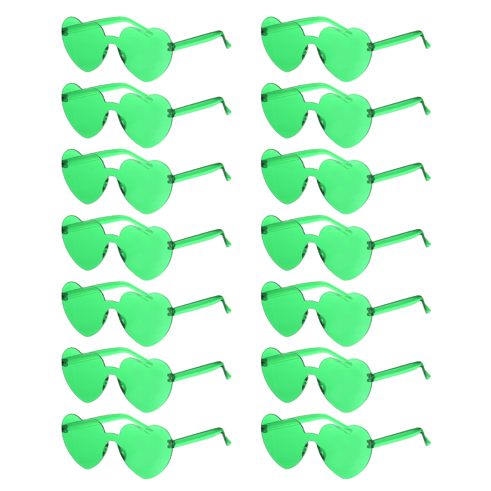 カラー:蛍光緑;素材:プラスチック;サングラスの長さ:5.55"(141mm);サングラスの幅:2.52"(64mm);サングラスのの橋幅:0.47"(12mm);梱包リスト:14個のハート型サングラス