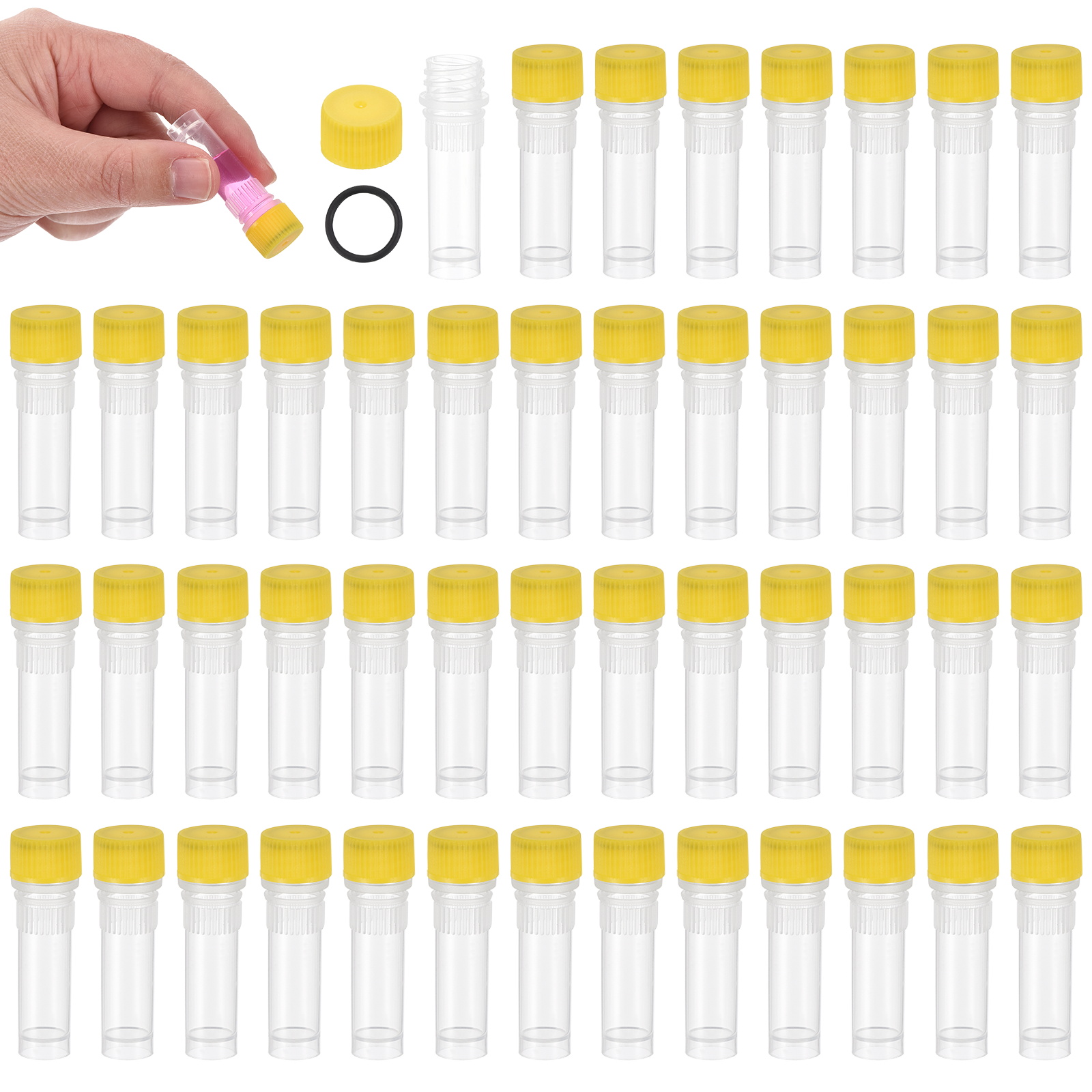 キャップのカラー:イエロー;ボトルのカラー:透明;材質:PP(ポリプロピレン);容量:1ml;ボトル口の外径:11mm;ボトルの高さ:39mm;全体サイズ:40x10mm(H*OD);梱包リスト:48xキャップ付き試験管