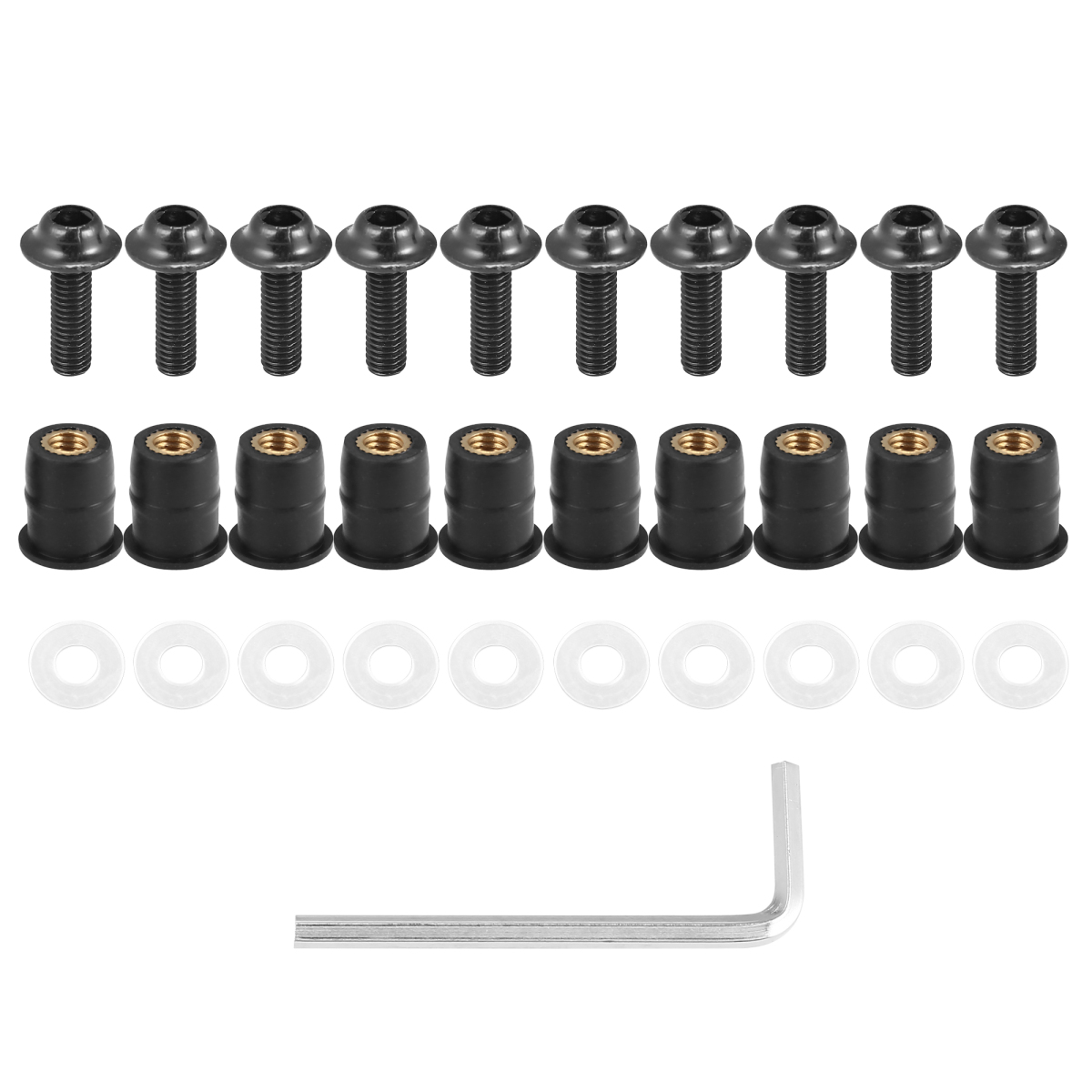 パッケージに内容:10 x オートバイのフロントガラスボルト, 10 x ナット, 10 x ゴムガスケット, 1 x レンチ。