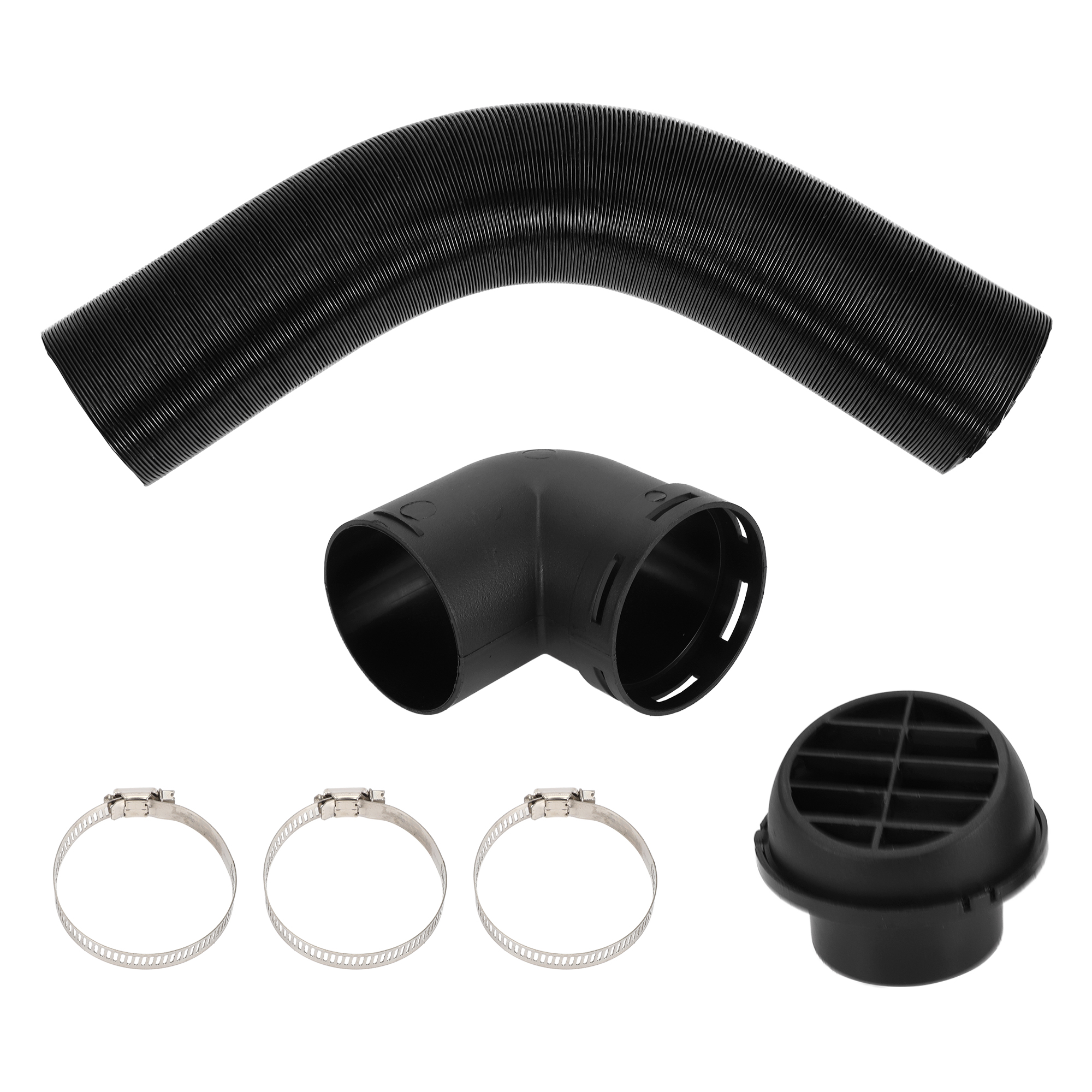 パッケージに含まれるもの: 1セットの車用ヒーターダクトキット(1個のラウンドエアベントアウトレットカバー、1個の曲がったパイプコネクター、3個のクランプ)