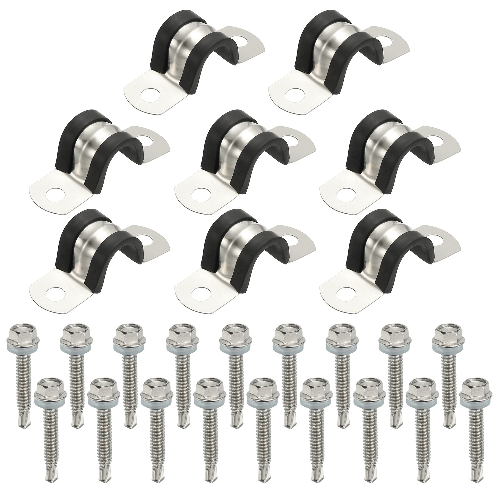 素材:304ステンレススチール、ラバー;内径:14mm / 9/16インチ;ねじ穴径:6mm / 1/4インチ;厚さ:0.6mm;幅:18mm / 11/16インチ;パッキングリスト:パイプクランプ8個、M5.5*32自己攻釘六角スクリュー18個<br>