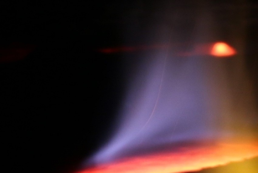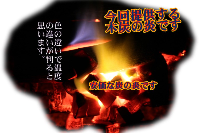 下に映し出される黄色い炎は、安価な炭の炎です。 この青いガスのような炎が、今回販売する木炭(樫の木)の炎です。
