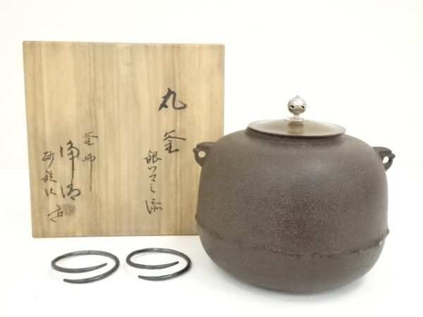 ys7280045; 宗sou 釜師 佐藤浄清造 銀摘添砂鉄丸釜(共箱)【道】