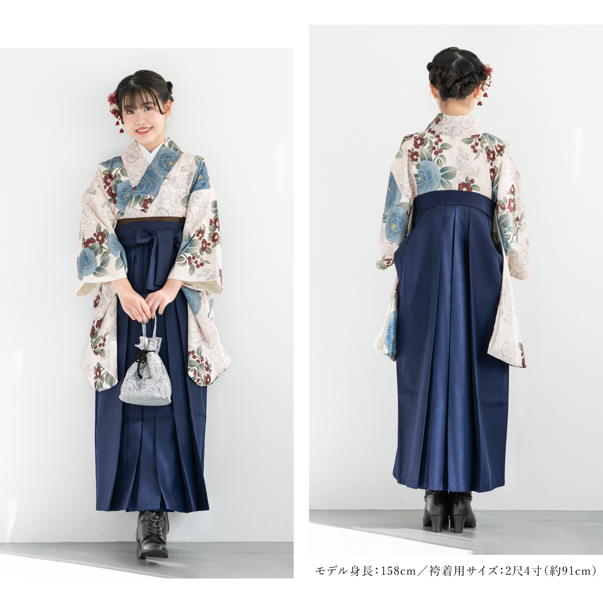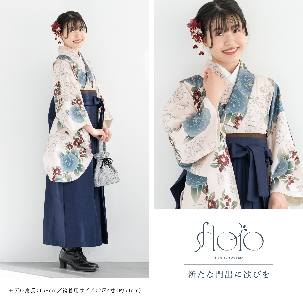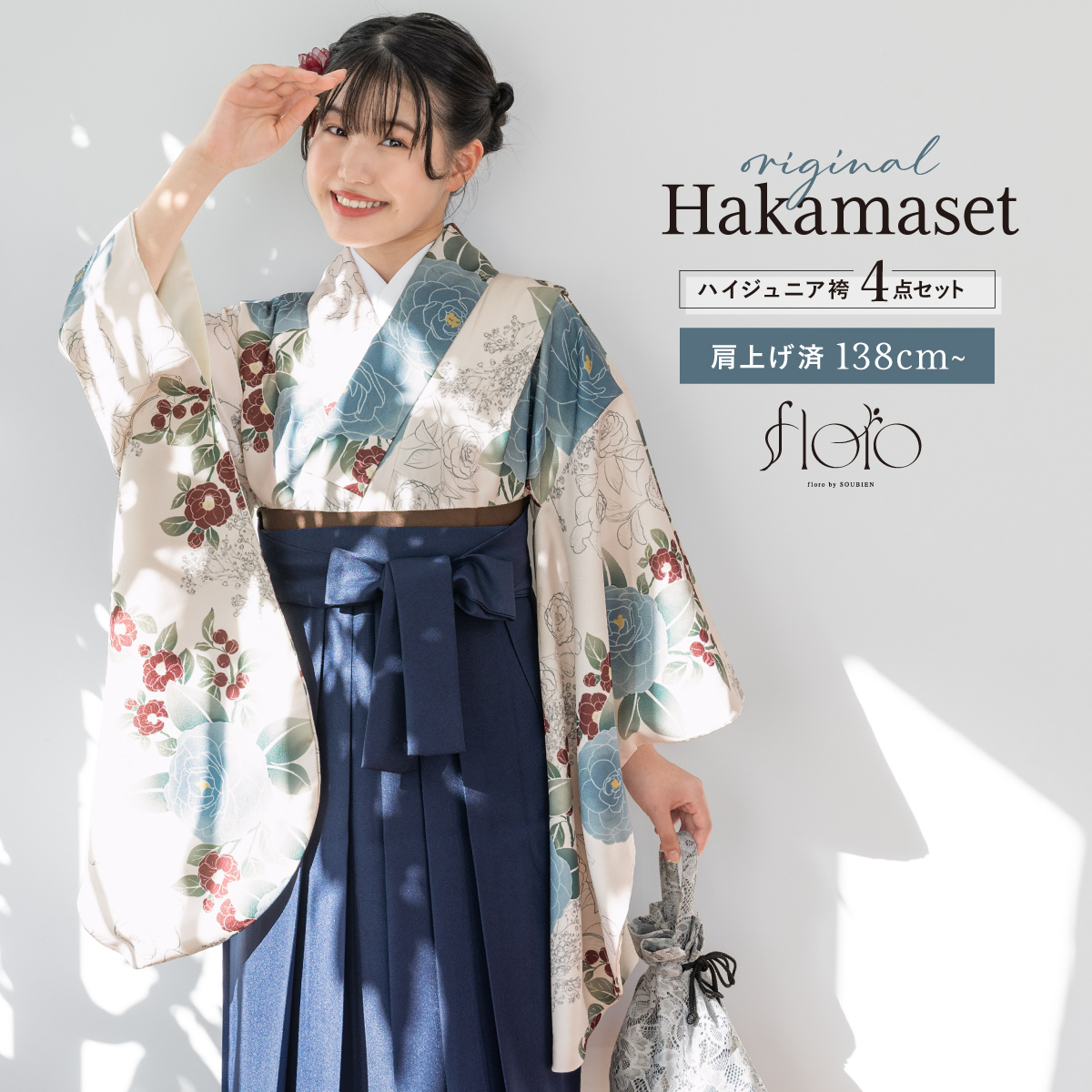 袴セット 卒業式 小学生 女の子 ジュニア floro クリーム色 白 青 ネイビー 紺 花 販売 13歳 和装 着物セット 購入 創美苑