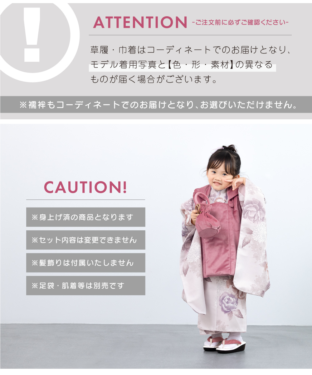 ※襦袢・巾着・草履の色柄や形状は当店スタッフのおまかせとなり、ご指定はいただけません。予めご了承ください。