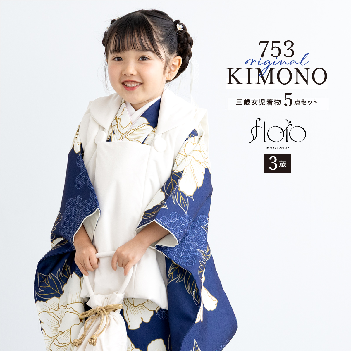 七五三 着物 3歳 レトロ 被布 販売 女の子 三歳 着物セット 被布コート 襦袢 草履 セット floro 白 紺 花柄 和装 女児 子供 創美苑