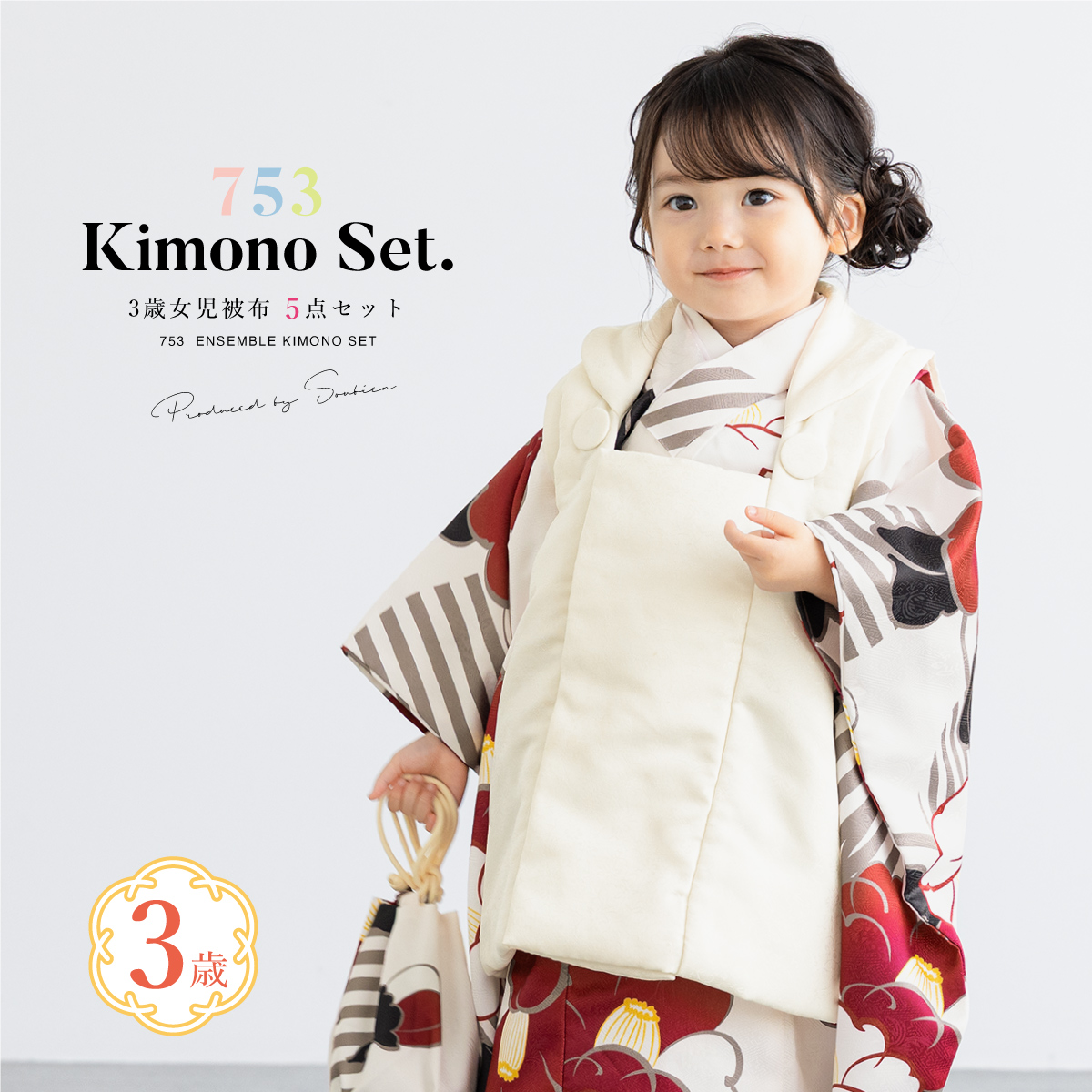七五三 着物 3歳 販売 女の子 三歳 着物セット 被布セット 白 アイボリー 椿 水玉 ストライプ 被布着 きもの 和服 和装 女児 子供 かわいい レトロ