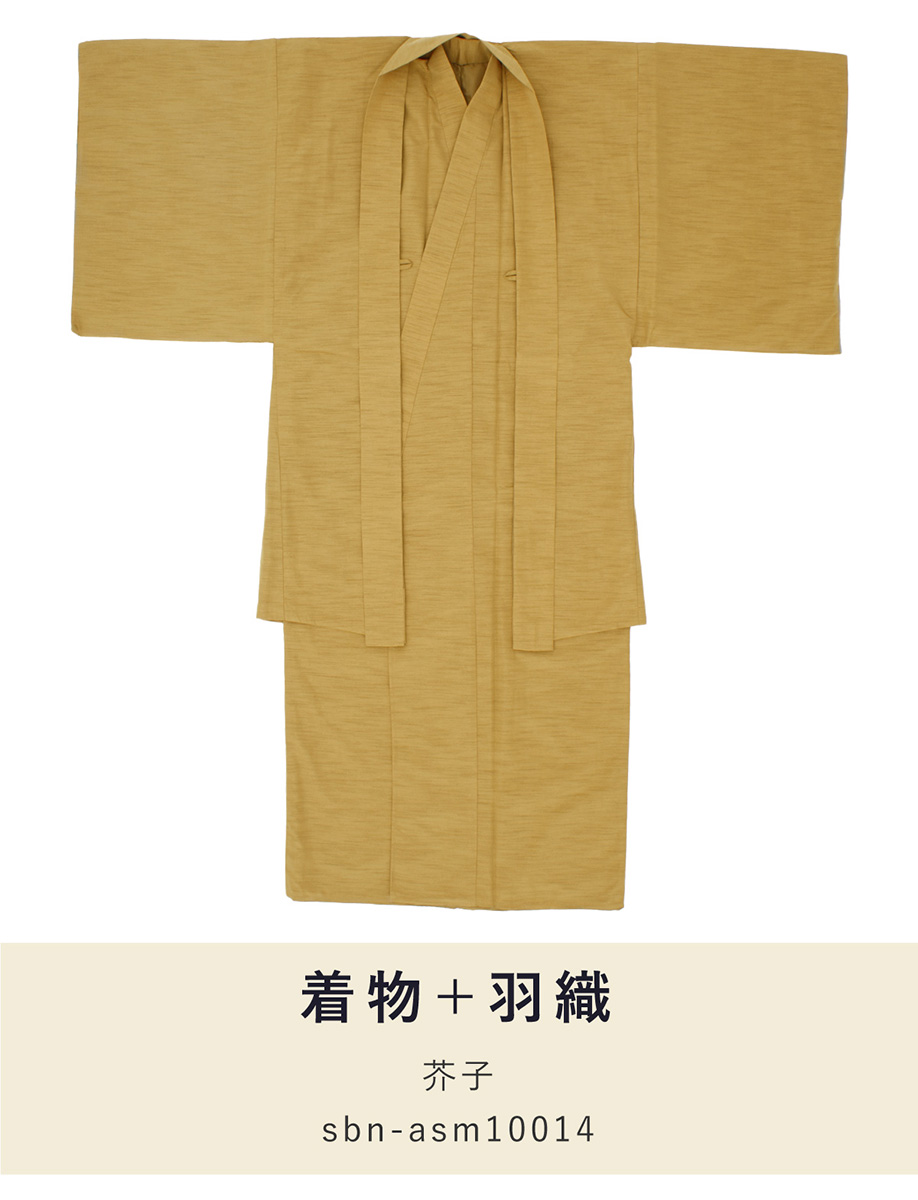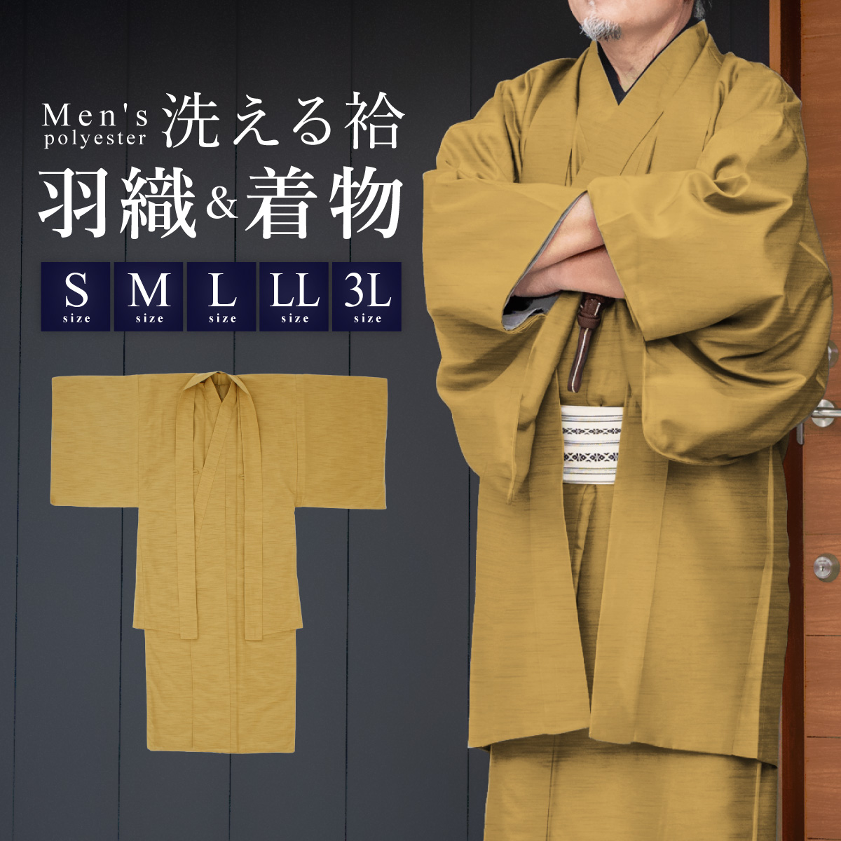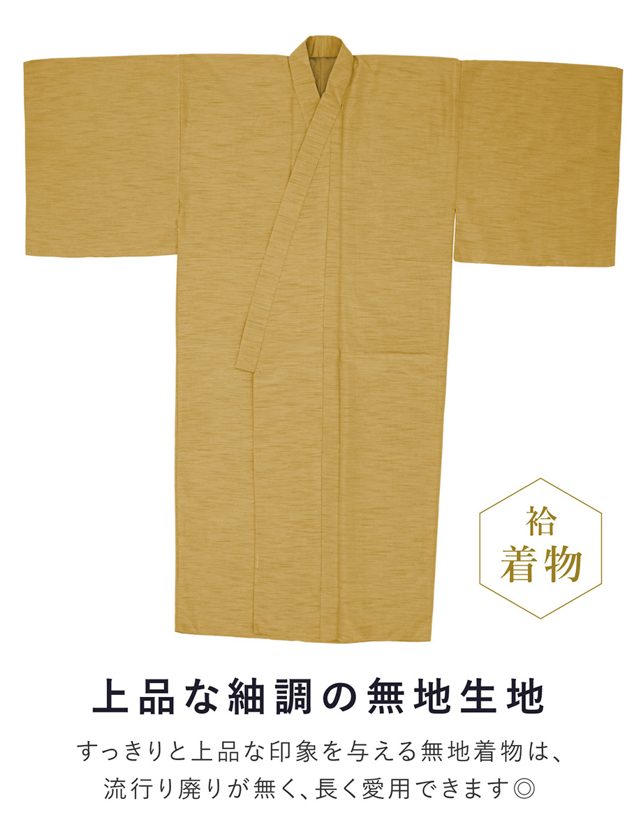 着物 羽織 メンズ セット アンサンブル 袷 カジュアル 無地 紬調 芥子 からし色 黄 シンプル S M L LL 3L 男性 仕立て上がり 送料無料