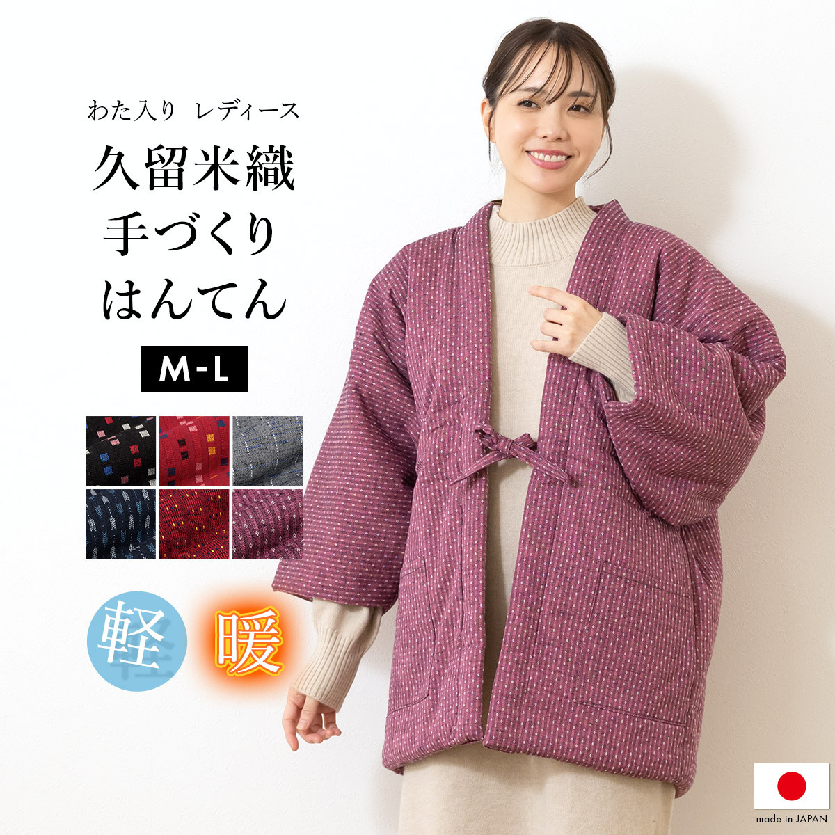 半纏 レディース 女性 ハンテン 半天 久留米織 先染め 日本製 光延織物 縞 格子 絣 赤 紺 灰色 ピンク 袢纏 綿入れ 部屋着 防寒