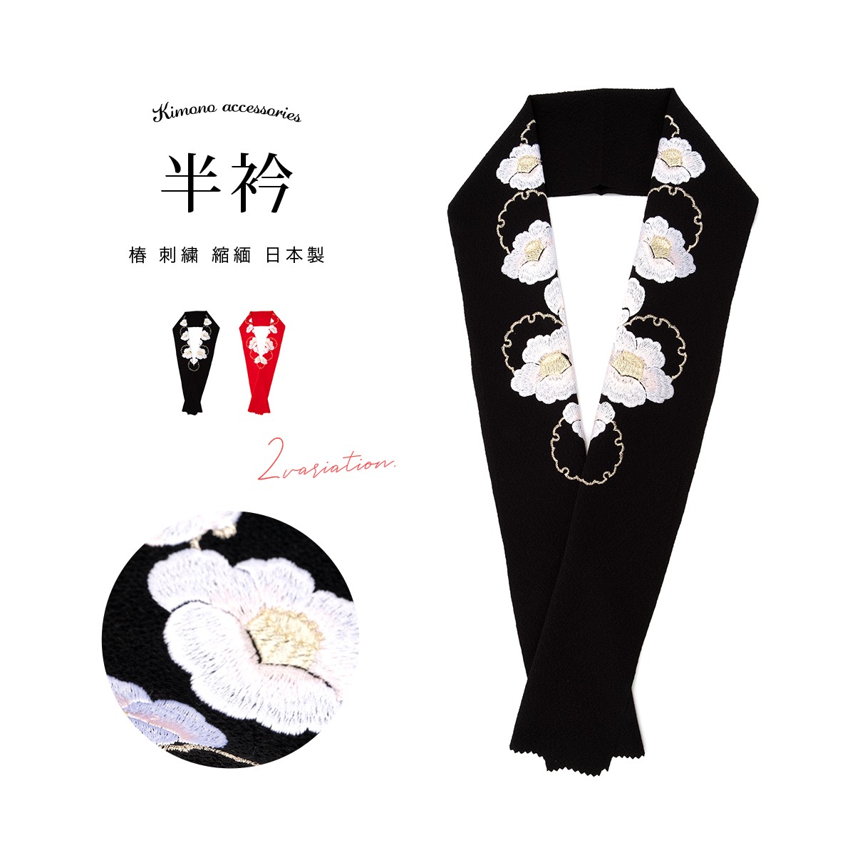 半襟 振袖 刺繍 成人式 半衿 袴 二尺着物 赤 レッド 黒 ブラック 椿 つばき 花 雪輪 和装小物 女性 レディース 日本製