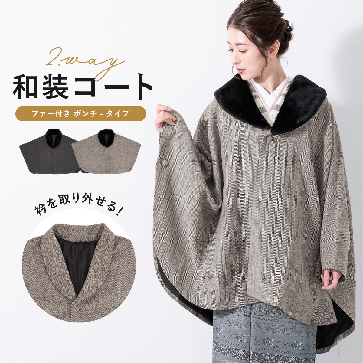 和装コート ケープコート レディース 和装 着物 コート 黒 ブラック グレー ブラウン 防寒 ウール混 フェイクファー ヘリンボーン フリーサイズ
