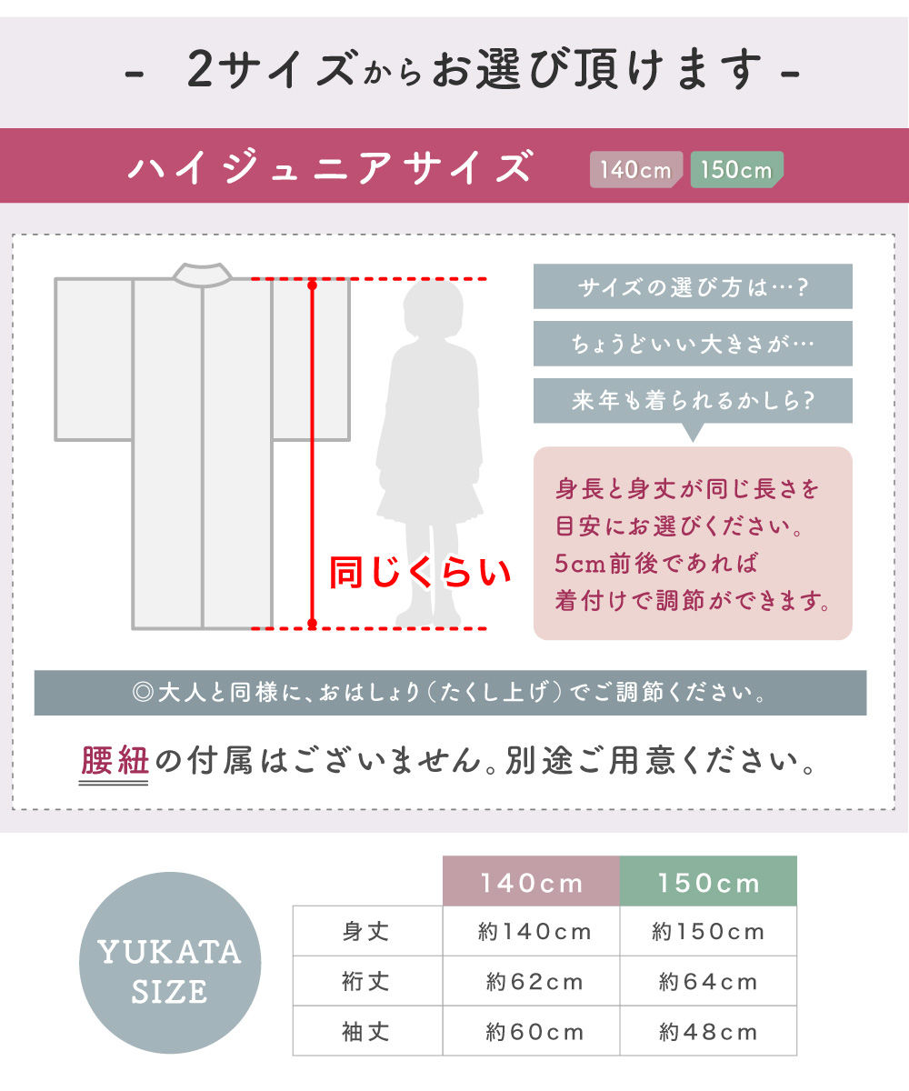 ※150cmの浴衣は大人サイズと同じ比率で作られているため袖丈が他の子供浴衣に比べて短くなっております。