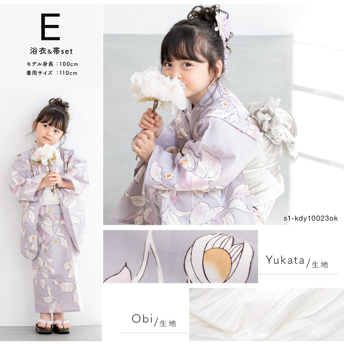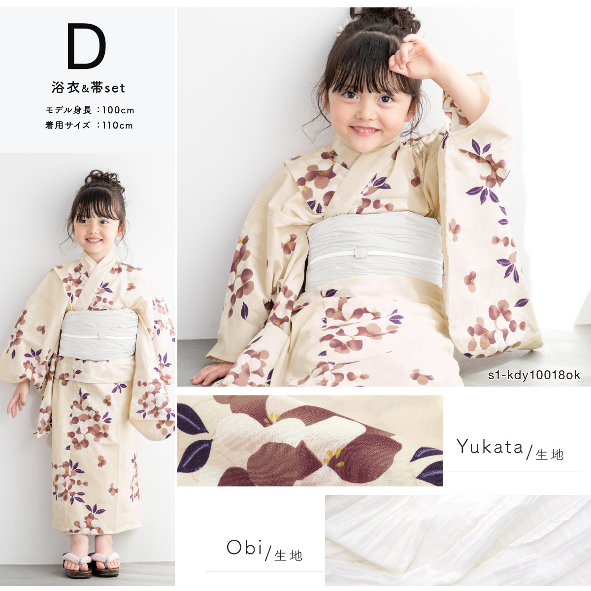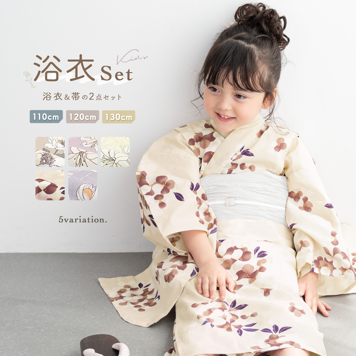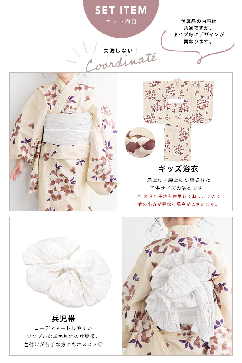 浴衣 子供 女の子 セット キッズ 兵児帯 浴衣セット 2点セット 綿 子ども服 モダン 紫 黄色 ベージュ 花柄 110 120 130