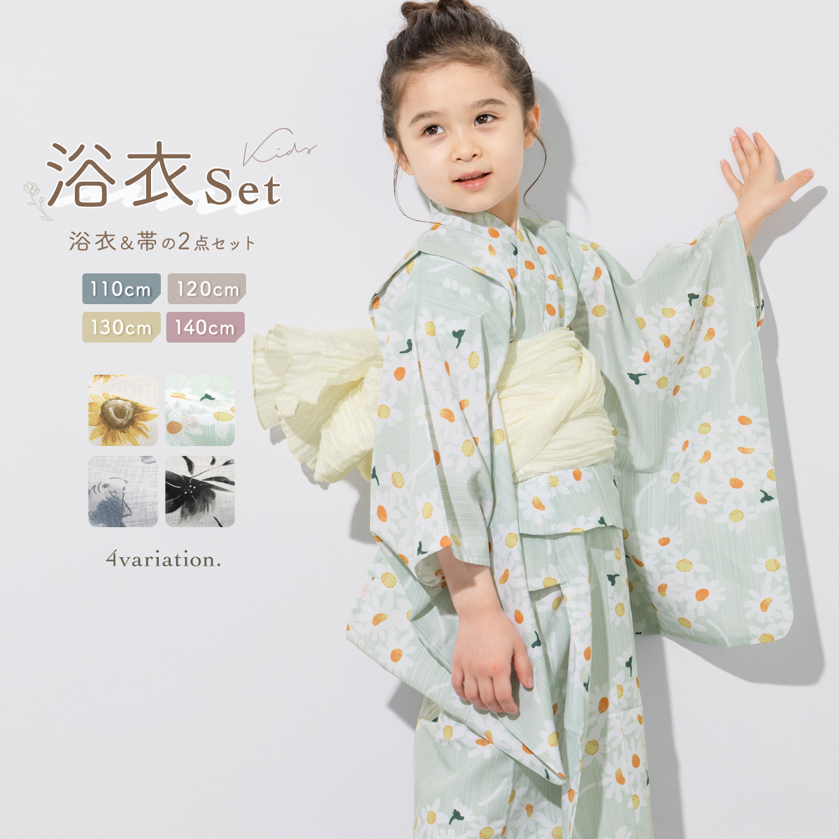 浴衣 子供 女の子 セット キッズ 兵児帯 浴衣セット 2点セット 吸水速乾 モダン 黒 白 金魚 花 110 120 130 140