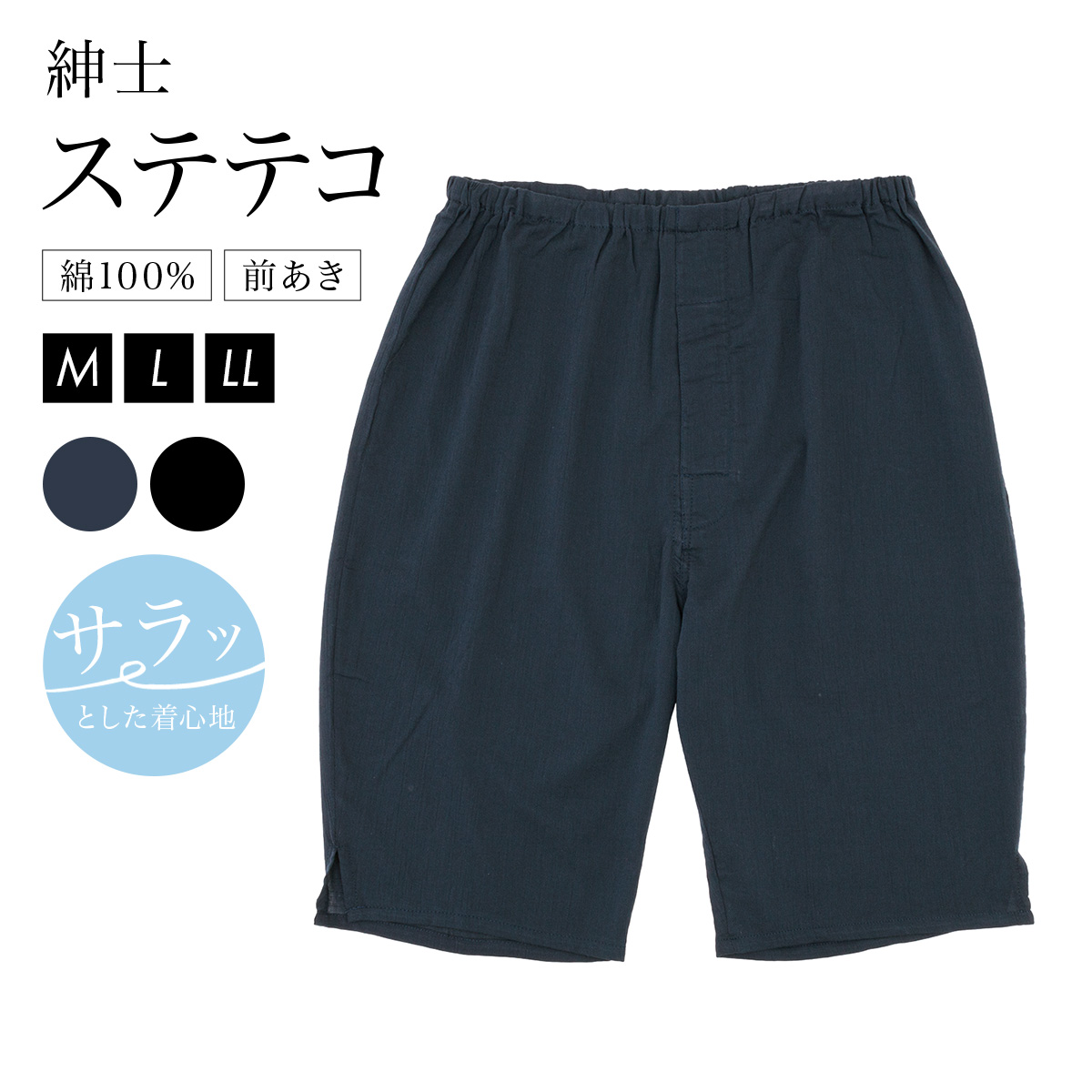 ステテコ メンズ 綿100% 下ばき 前開き 紳士 黒 ブラック 紺 ネイビー オールシーズン ハーフパンツ 和装下着 肌着 男性 着付け小物 和装小物 M L LL
