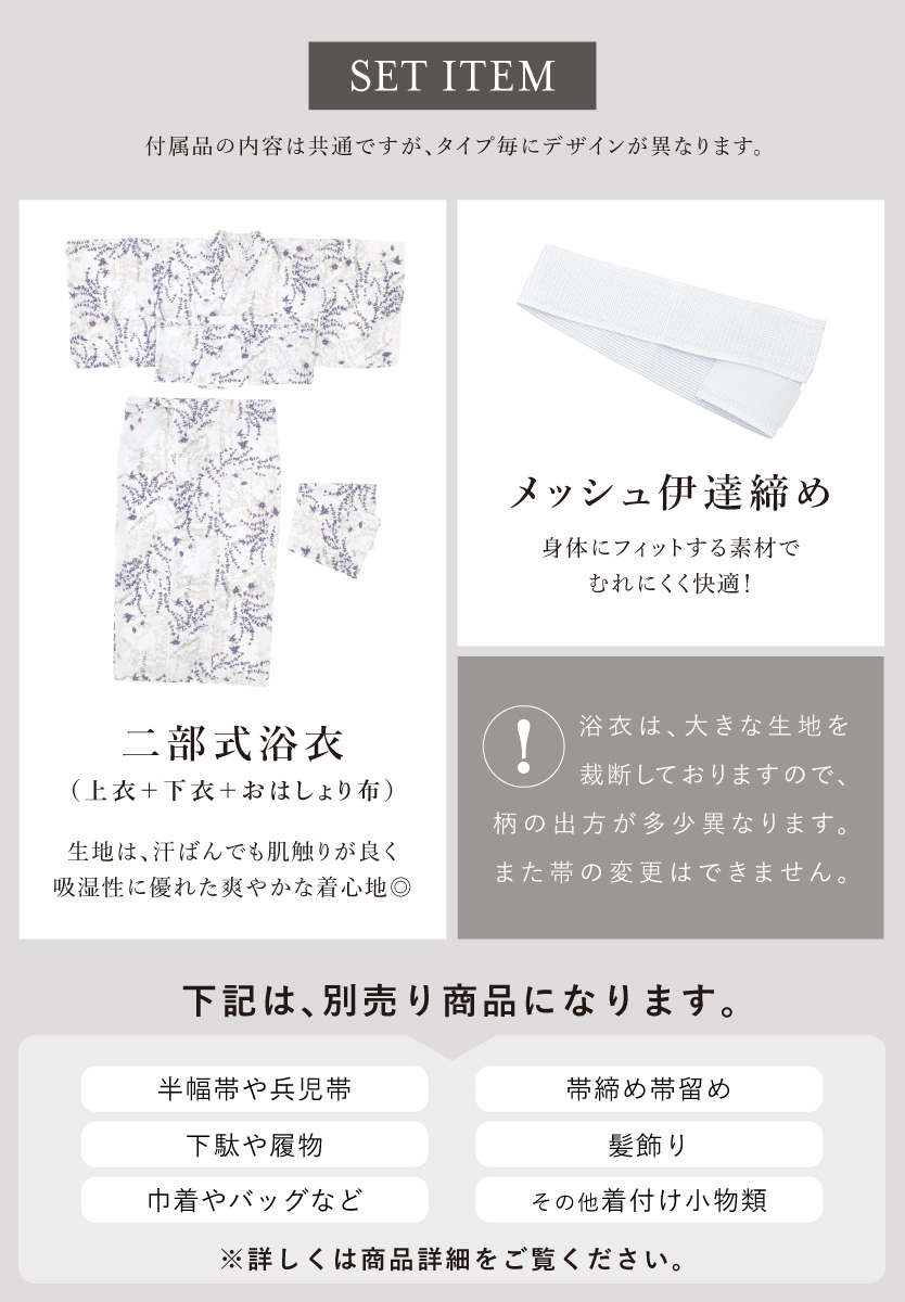 ※こちらはセパレート浴衣(上衣+下衣+おはしょり布、伊達締め付き)単品です。その他の商品は含まれません。