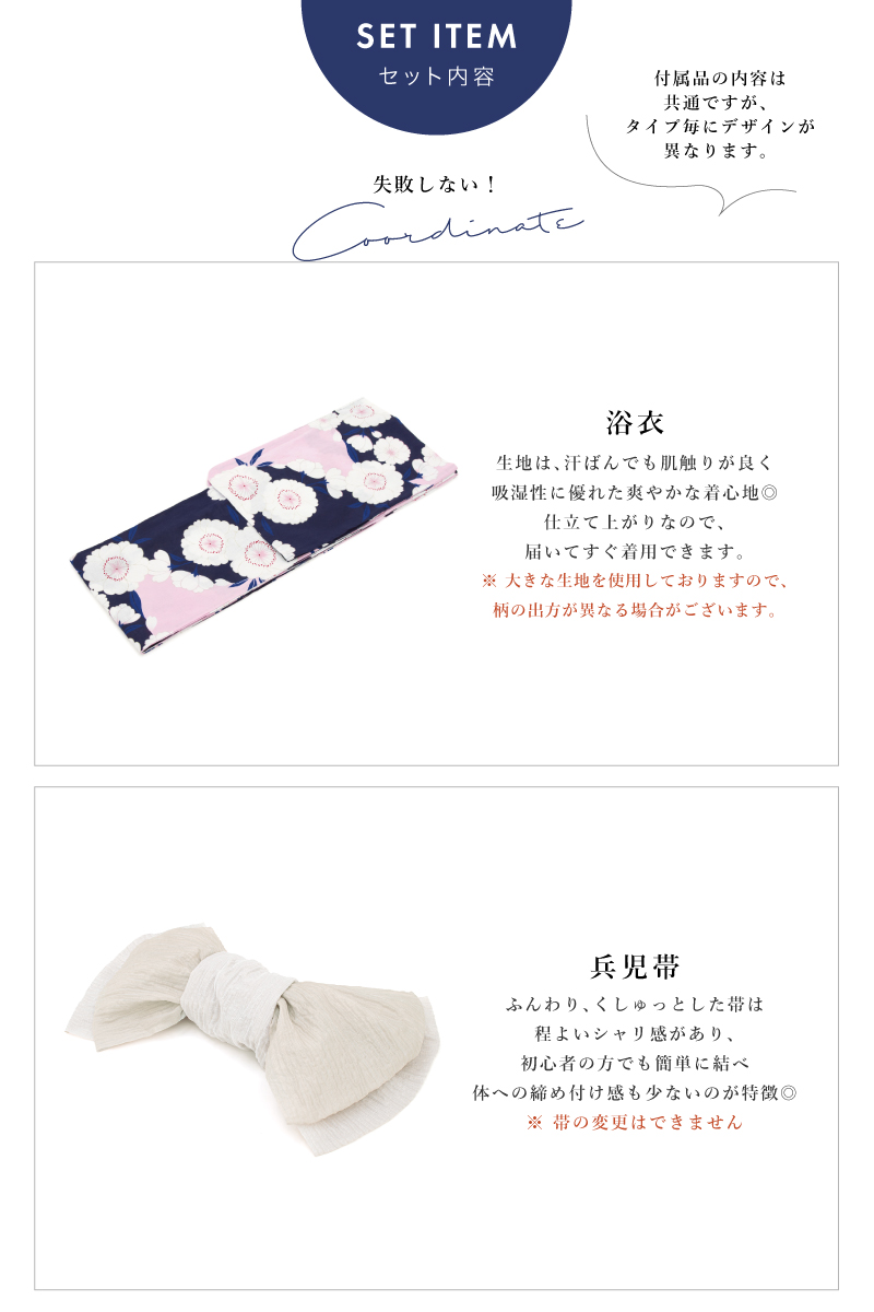 ※こちらの商品は、浴衣・帯の2点セットです。セット内容の一部変更や、それに伴う値引きは承っておりません。