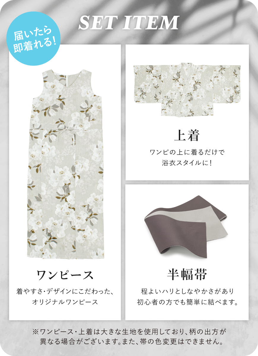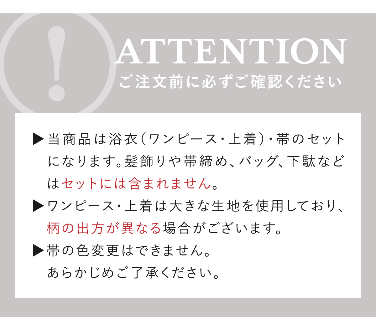 ※こちらの商品は、上着・ワンピース・帯の3点セットです。セット内容の一部変更や、それに伴う値引きは承っておりません。