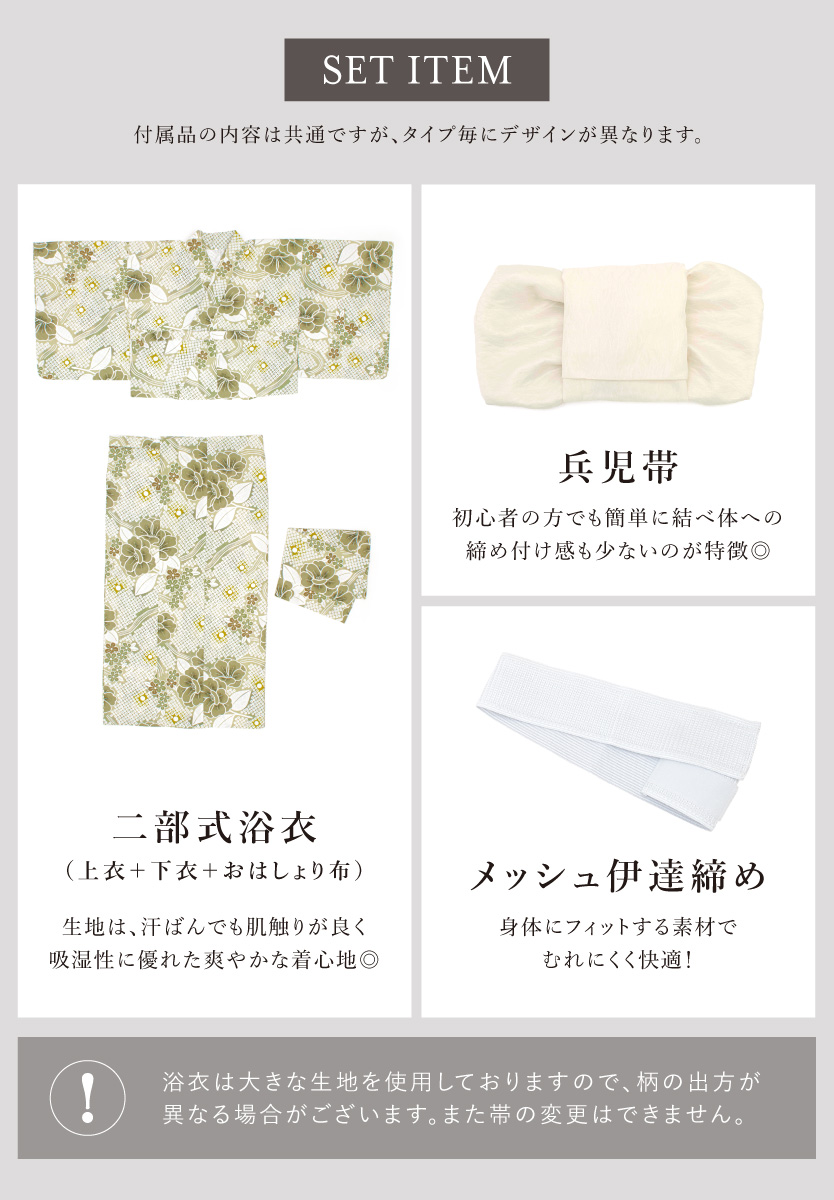 二部式浴衣(上衣+下衣+おはしょり布)、帯、伊達締め