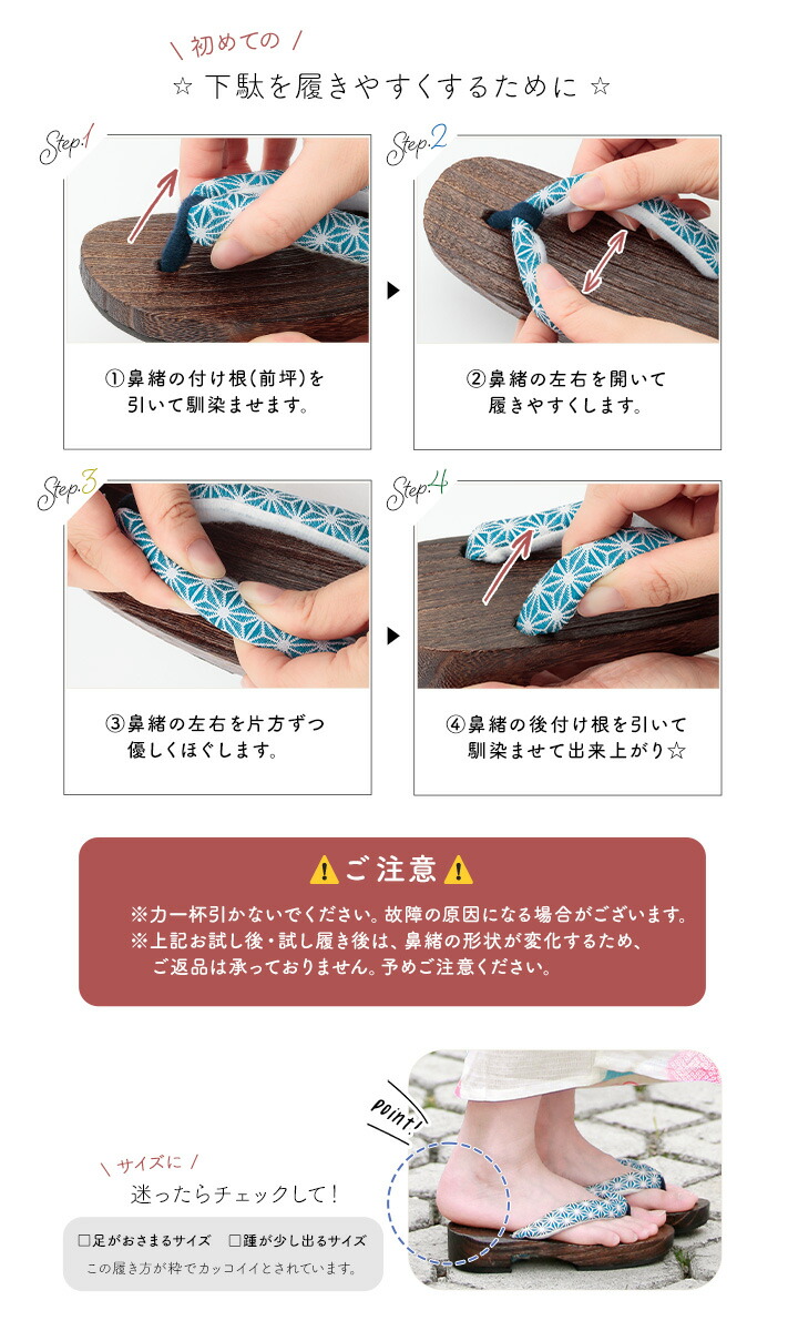 ※草履や下駄などの履物は、試し履きをされますと鼻緒の形状が変化するため、お試し後のご返品は承っておりません。ご注意ください。