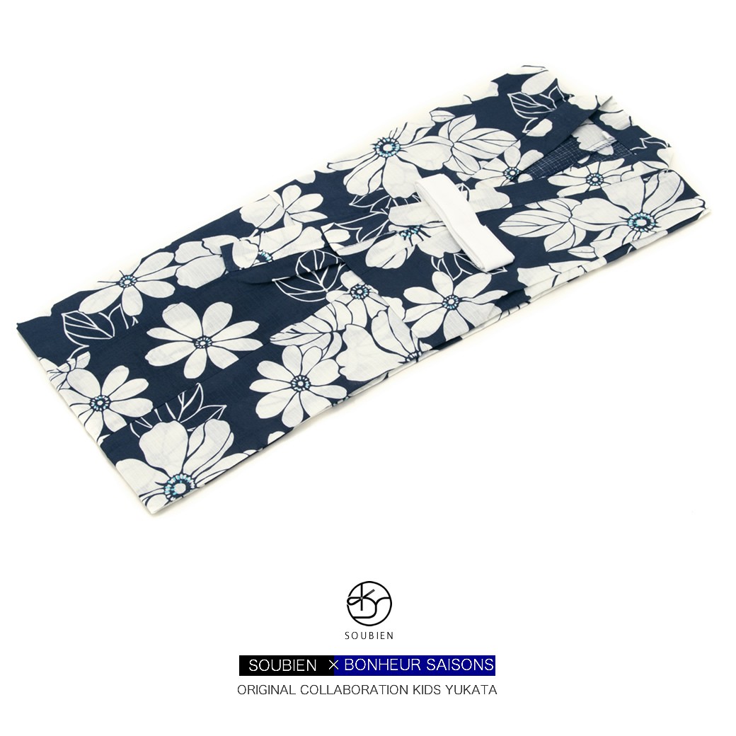 浴衣 子供 女の子 キッズ 単品 創美苑オリジナル bonheur saisons ボヌールセゾン 濃紺色 ネイビー 白 ホワイト 花 綿 紅梅織 110 120 130