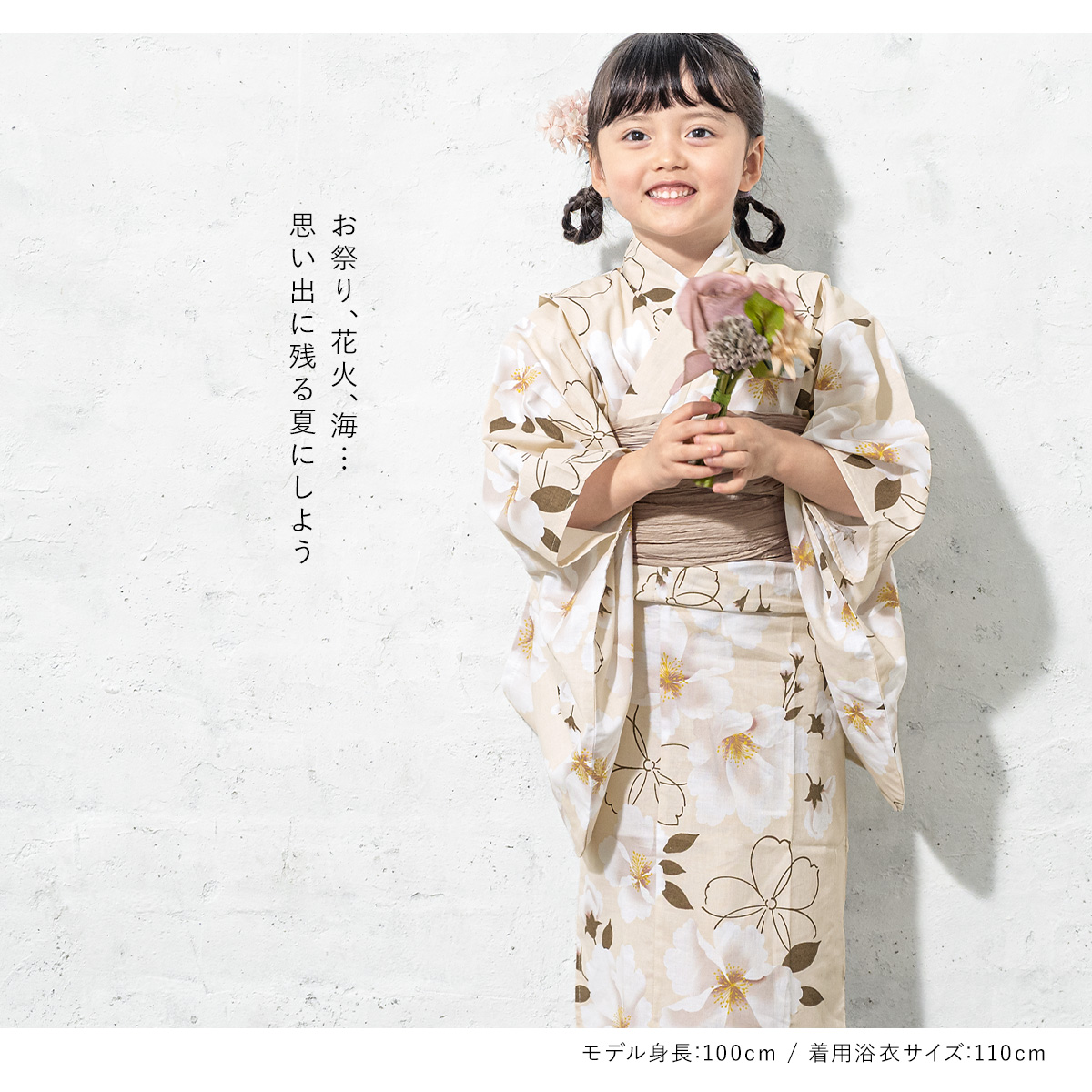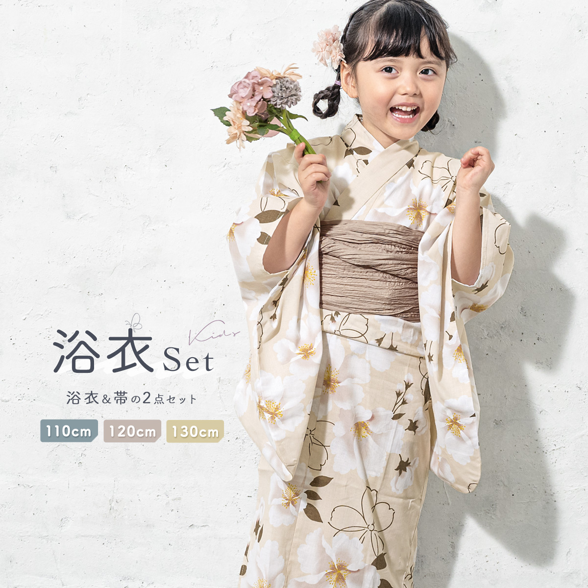浴衣 子供 女の子 セット 2点セット キッズ 女児 ライトベージュ系 桜 花 フラワー ベージュ 綿 夏 110cm 120cm 130cm 送料無料 2026