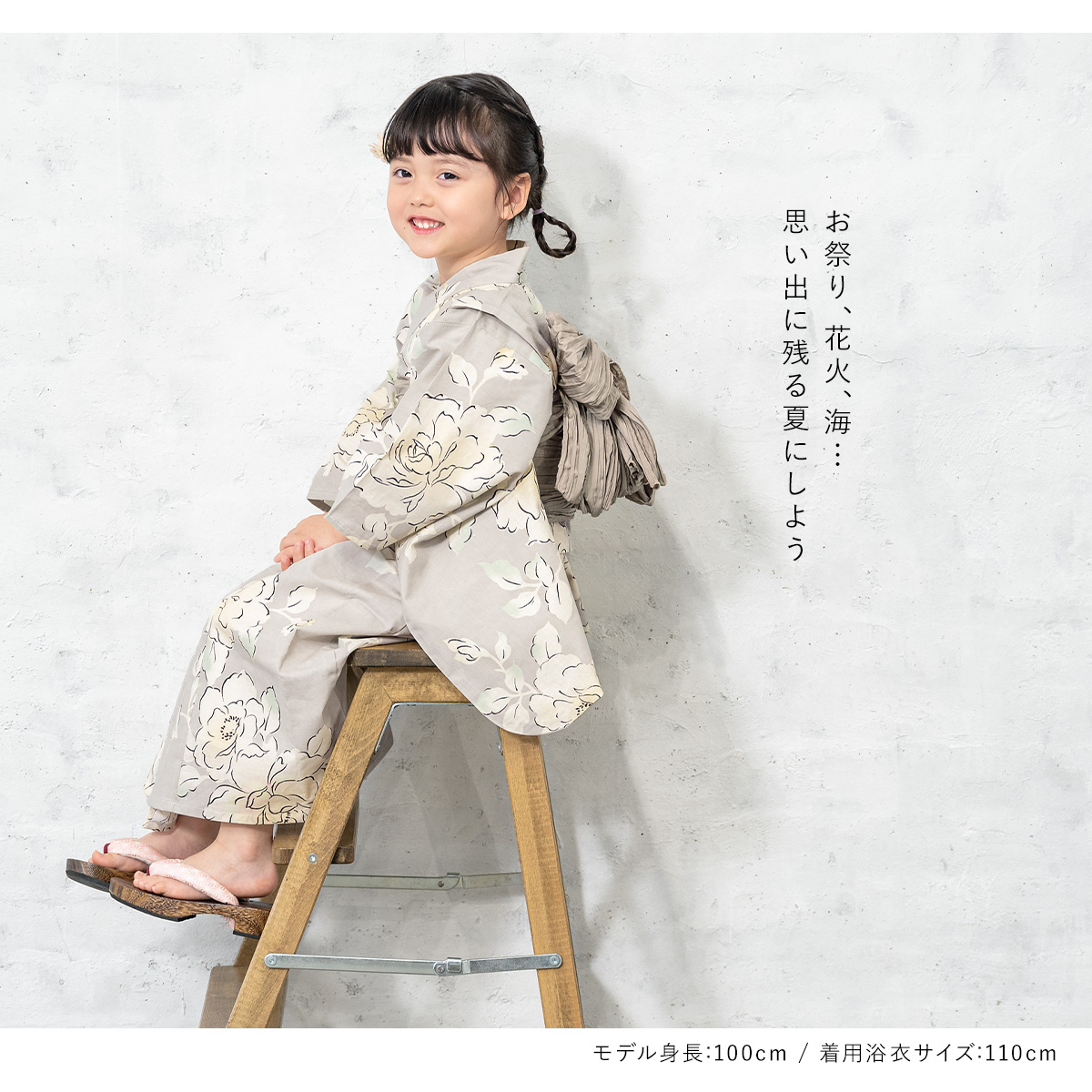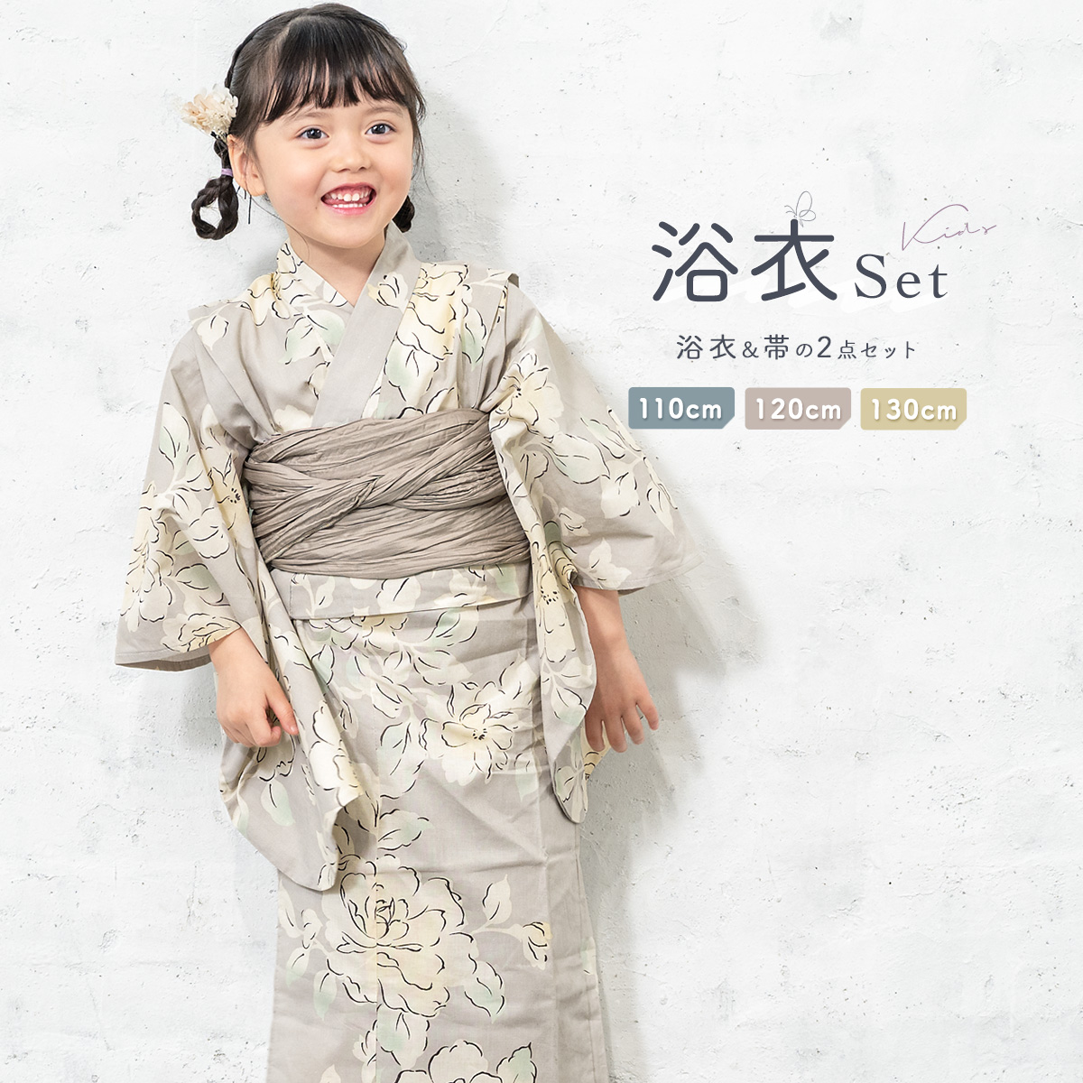 浴衣 子供 女の子 セット 2点セット キッズ 女児 グレージュ 牡丹 花 フラワー 白茶 綿 夏 110cm 120cm 130cm 送料無料 2026