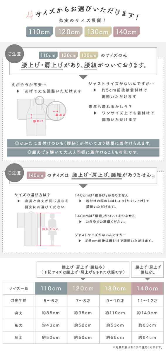 ※110~130cmは腰紐付きで、肩上げ・腰上げが施されております。身丈と裄丈は上げが施された状態の長さです。