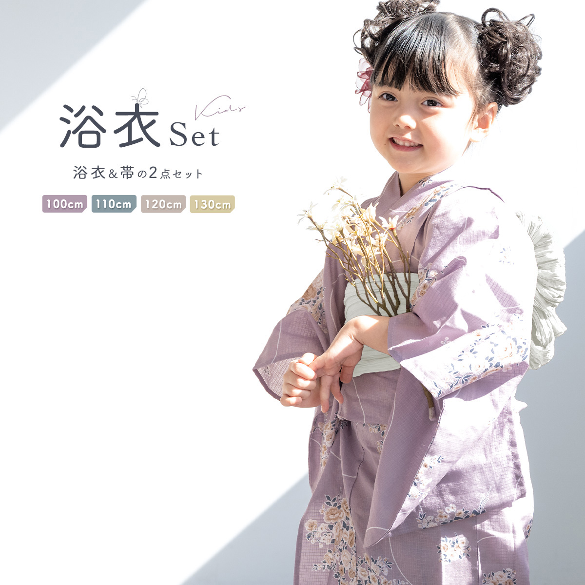 浴衣 子供 女の子 セット 2点セット キッズ 女児 パープル系 紫 薔薇 バラ 花柄 白茶 綿 夏 100cm 110cm 120cm 130cm 送料無料 2025新作
