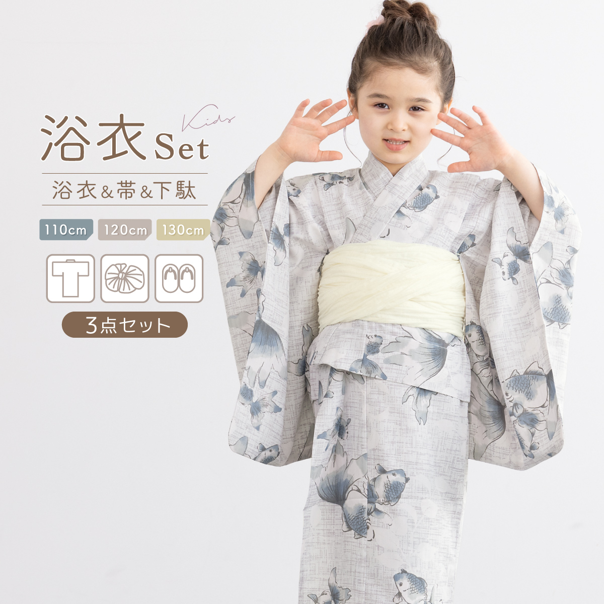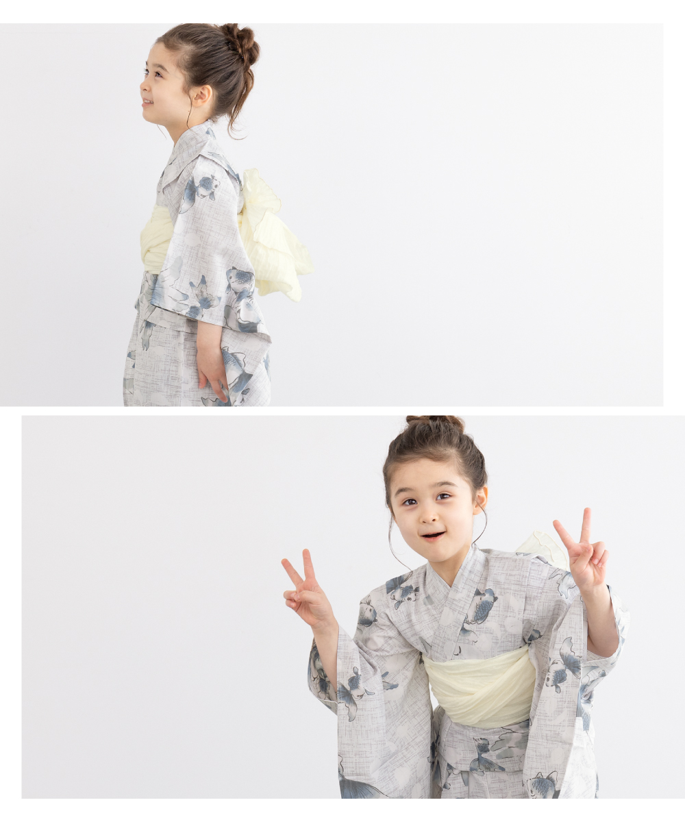 浴衣 女の子 浴衣セット キッズ 子供 兵児帯 3点セット モダン ブルーグレー 白 金魚 花火 下駄 帯 夏 祭 110 120 130 送料無料 2026