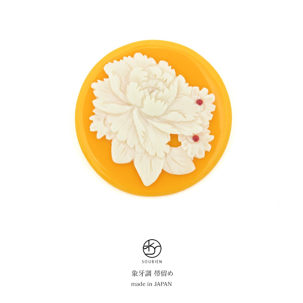 帯留め 黄色 イエロー 象牙色 アイボリー 牡丹 花 フラワー 円形 帯どめ おびどめ 和装小物 振袖向き 成人式 フォーマル カジュアル 日本製