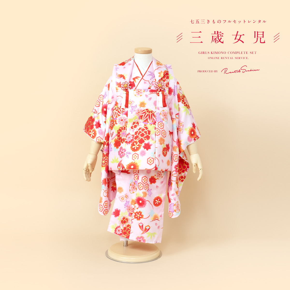 レンタル 七五三 女の子 3歳 着物 被布 フルセット ピンク 鞠 牡丹 花尽くし 着物セット 被布セット 753 人気 子供着物 創美苑