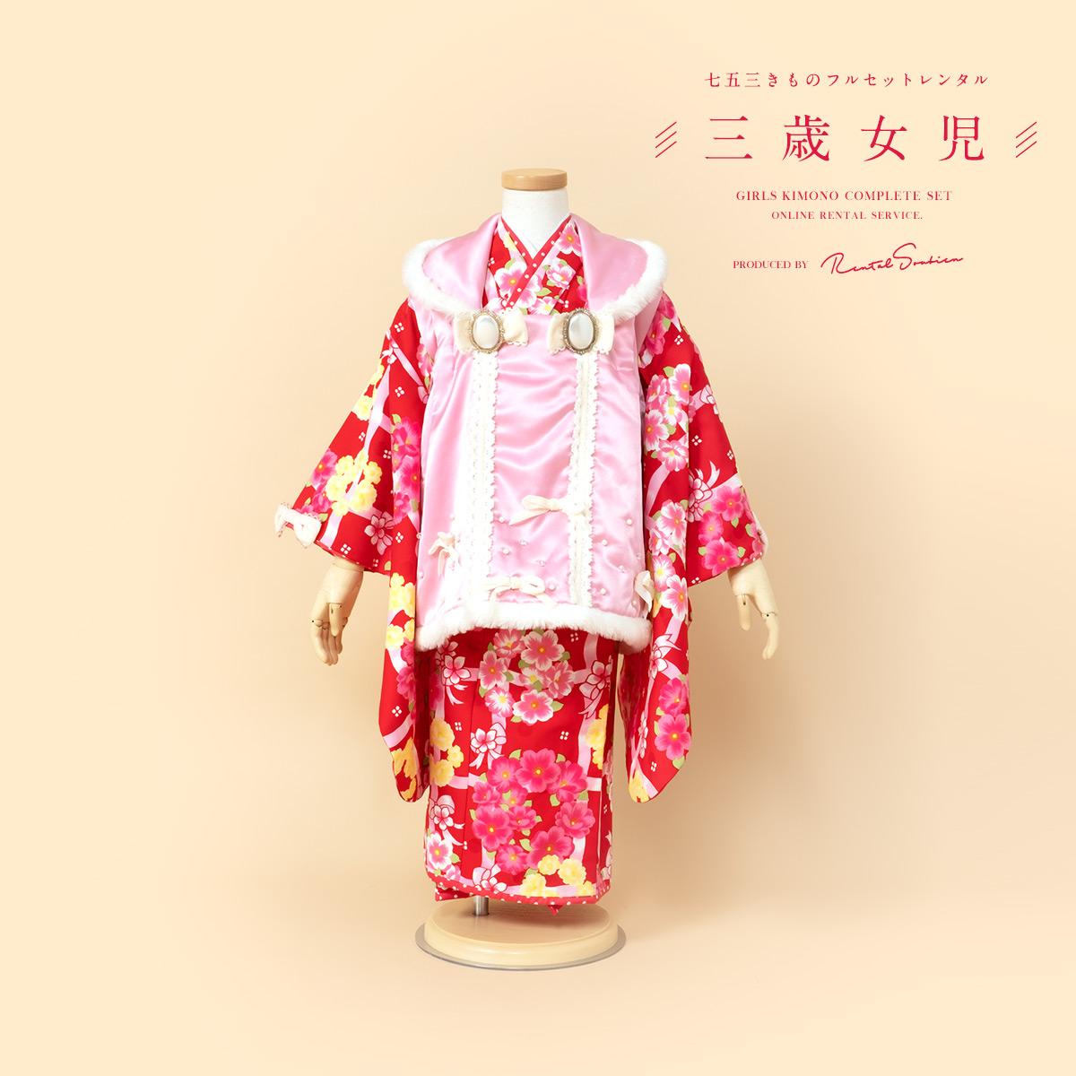 レンタル 七五三 女の子 3歳 着物 被布 フルセット ピンク 赤 花尽くし リボン ブローチ 着物セット 被布セット 753 人気 子供着物 創美苑