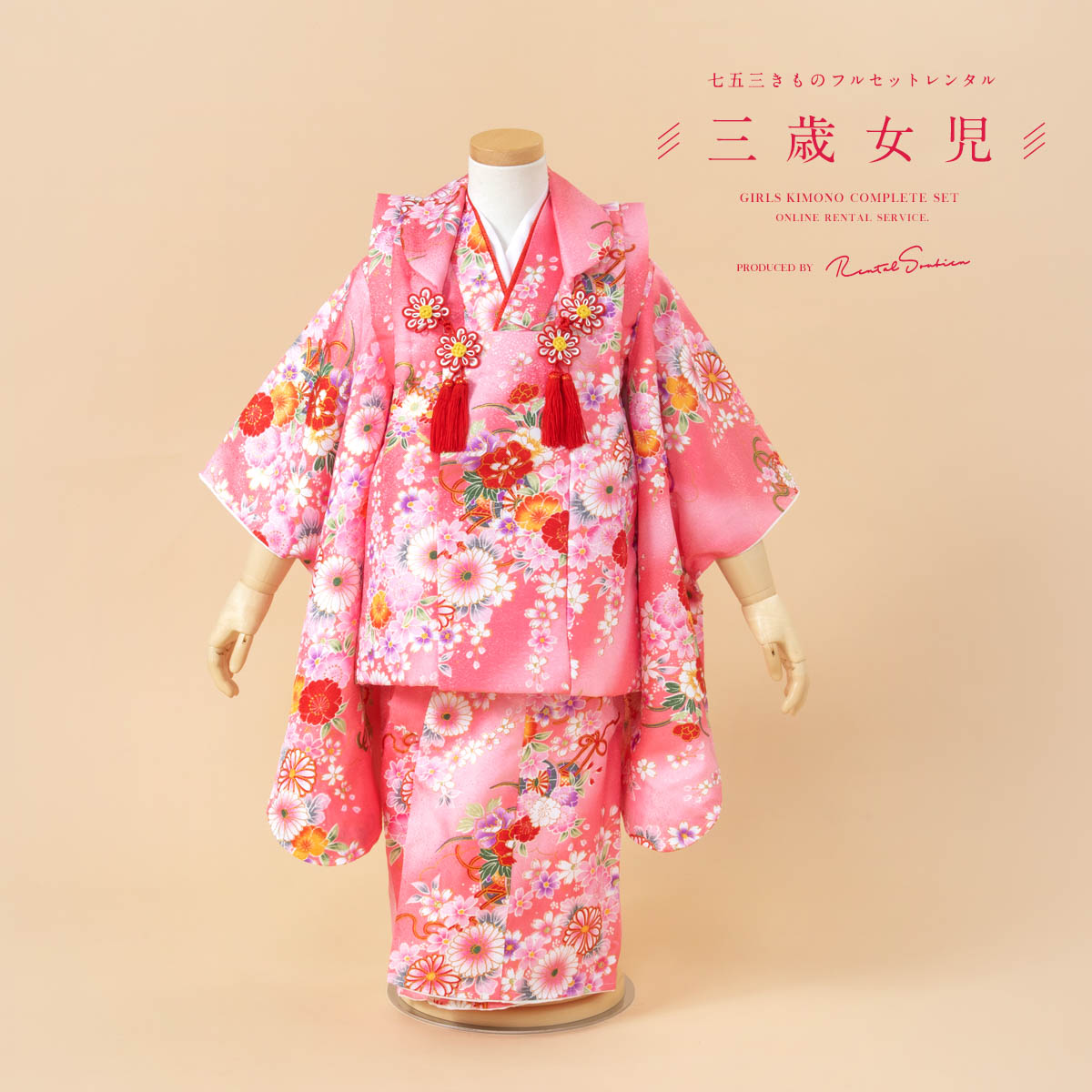 レンタル 七五三 女の子 3歳 着物 被布 フルセット ピンク 菊 花車 桜 着物セット 被布セット 753 人気 子供着物 創美苑