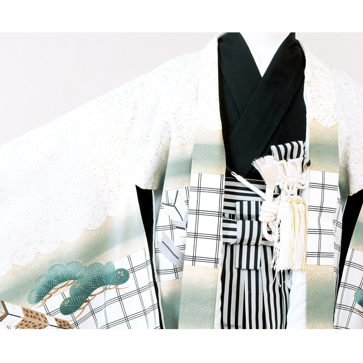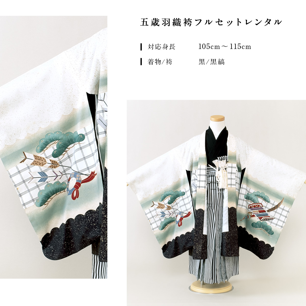 七五三 着物 レンタル 5歳 男の子 フルセット 袴セット 白 ホワイト 黒 兜 鷹 松 格子 羽織 和服 和装 男児 創美苑