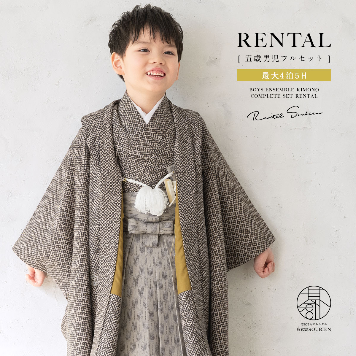 七五三 着物 レンタル 5歳 男の子 フルセット 袴セット 黒茶色 ブラウン 鹿の子 絞り柄 鍔 鐔 レトロ 羽織 和服 和装 男児 創美苑