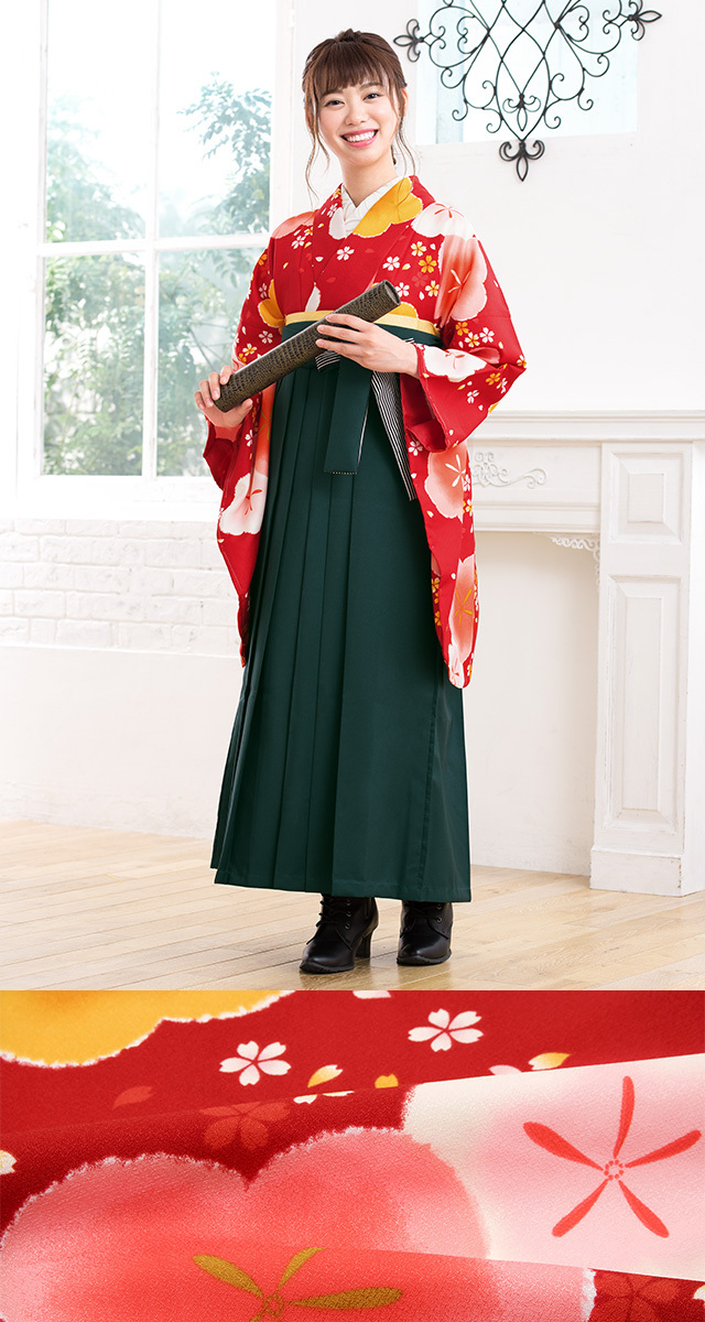 レンタル 卒業式 袴 フルセット 女性 袴セット 赤 レッド 深緑色 梅 桜吹雪 花 小紋柄 着物セット 大学 レディース 創美苑