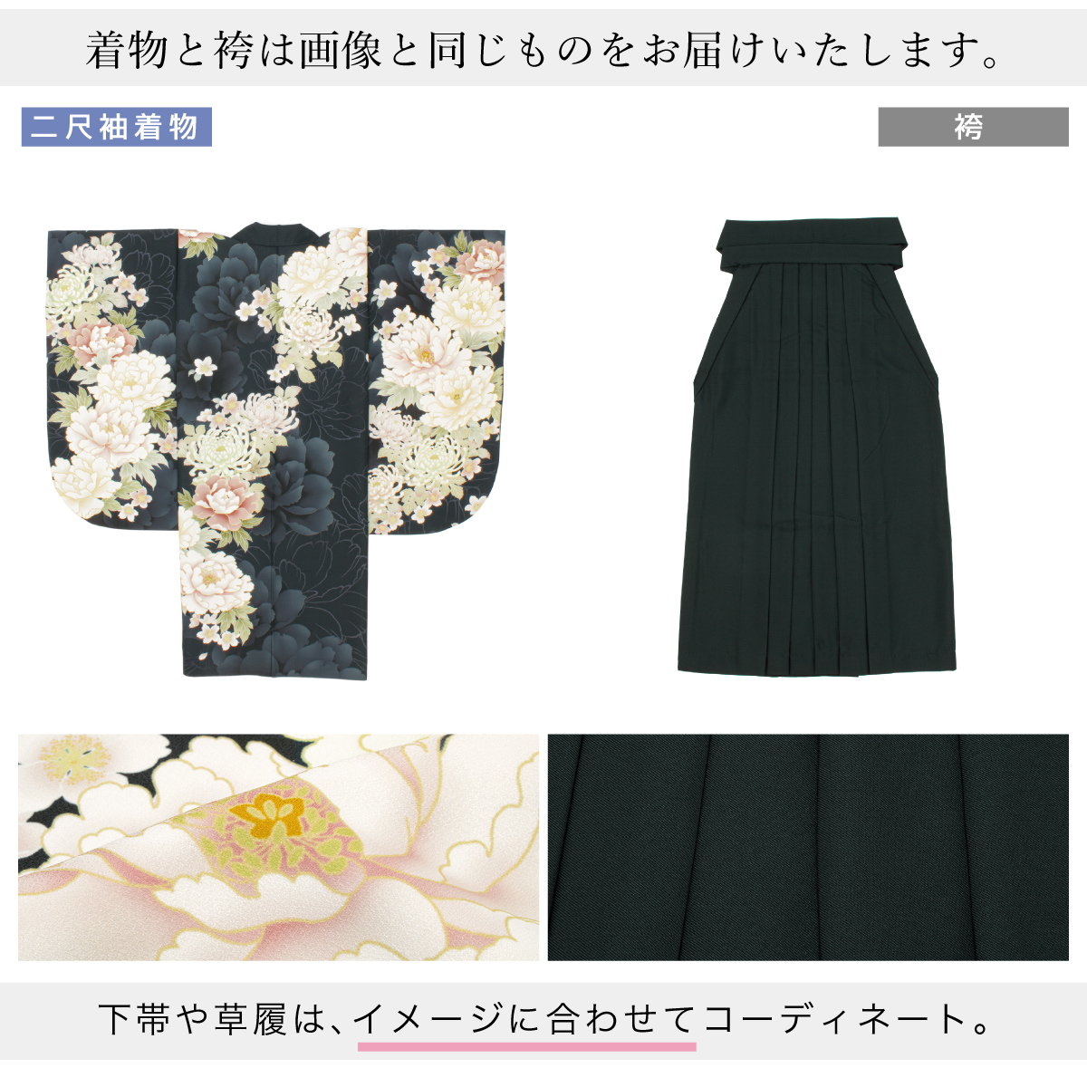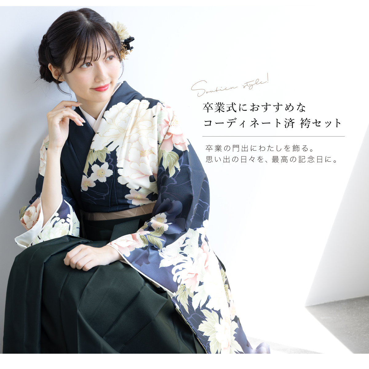着物・袴・下帯・前板・襦袢(半衿付)・衿芯・伊達締め×2・腰紐×4・着付けベルト・草履・足袋(プレゼント)