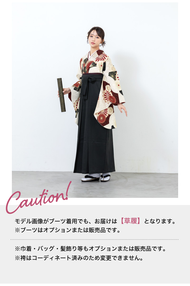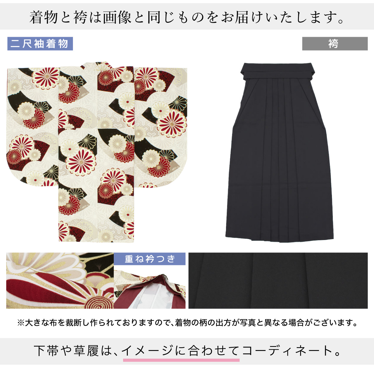 着物(重ね衿付)・袴・下帯・前板・襦袢(半衿付)・衿芯・伊達締め×2・腰紐×4・着付けベルト・草履・足袋(プレゼント)