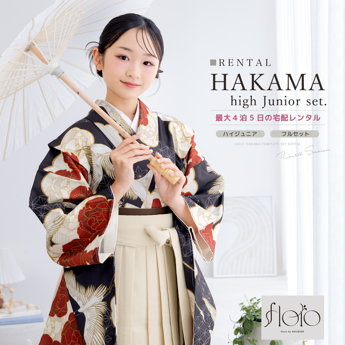 レンタル 袴 袴セット 卒業式 女の子 小学生 ジュニア 襦袢 草履 フルセット 和服 着物 floro 黒 白 レッド 花柄 モダン 鶴 SS S M L 140 150 160 創美苑