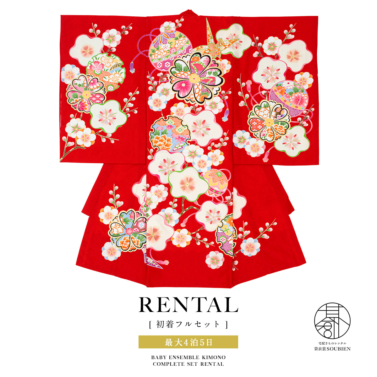 レンタル 産着 お宮参り 女の子 フルセット 赤 レッド 梅 雪輪 手鞠 ポリエステル 掛け着 うぶぎ 祝着 赤ちゃん 祝い着 帽子セット
