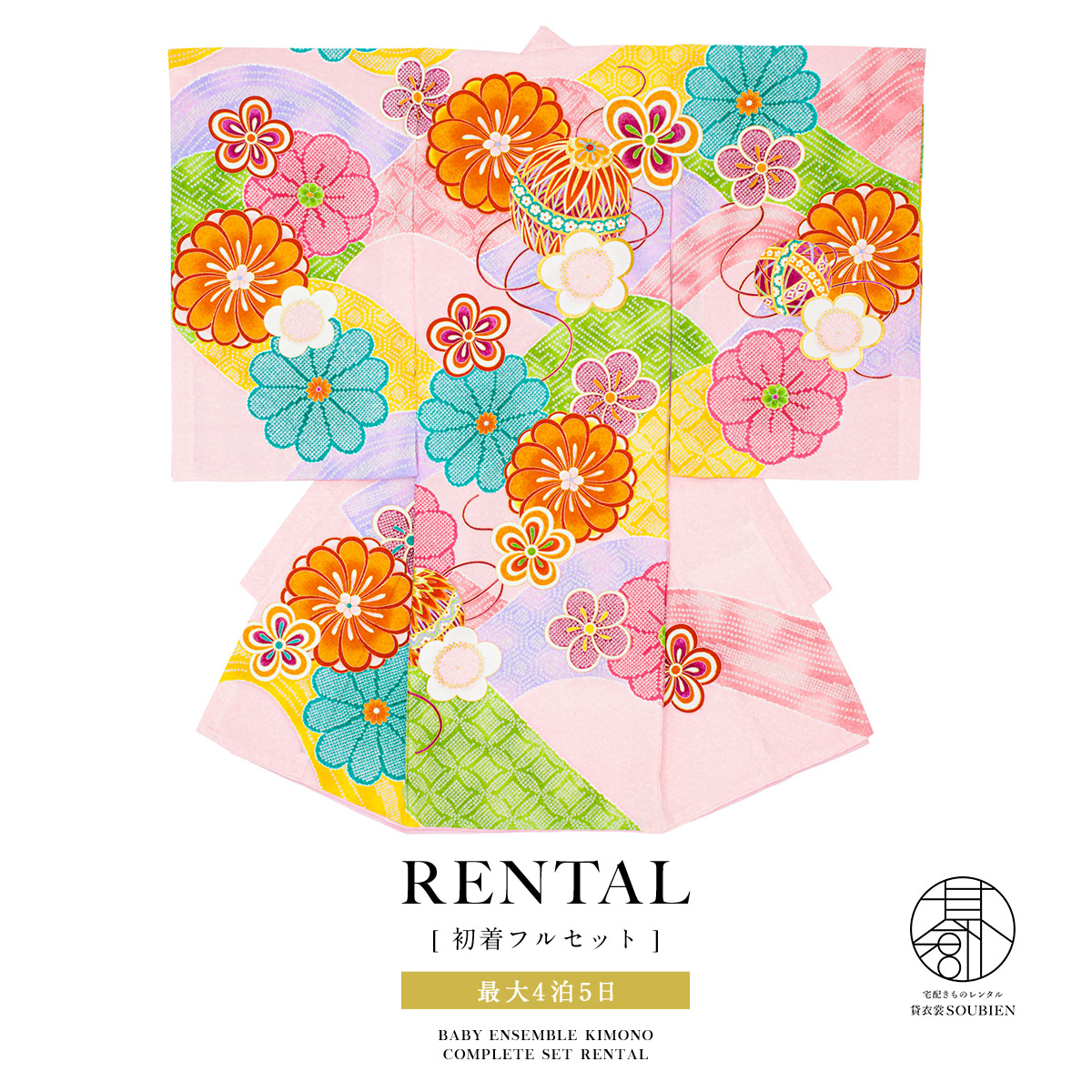 レンタル 産着 お宮参り 女の子 フルセット 桃色 ピンク 手鞠 鹿の子 フルセット 花 ポリエステル 掛け着 うぶぎ 祝着 赤ちゃん 祝い着 帽子セット