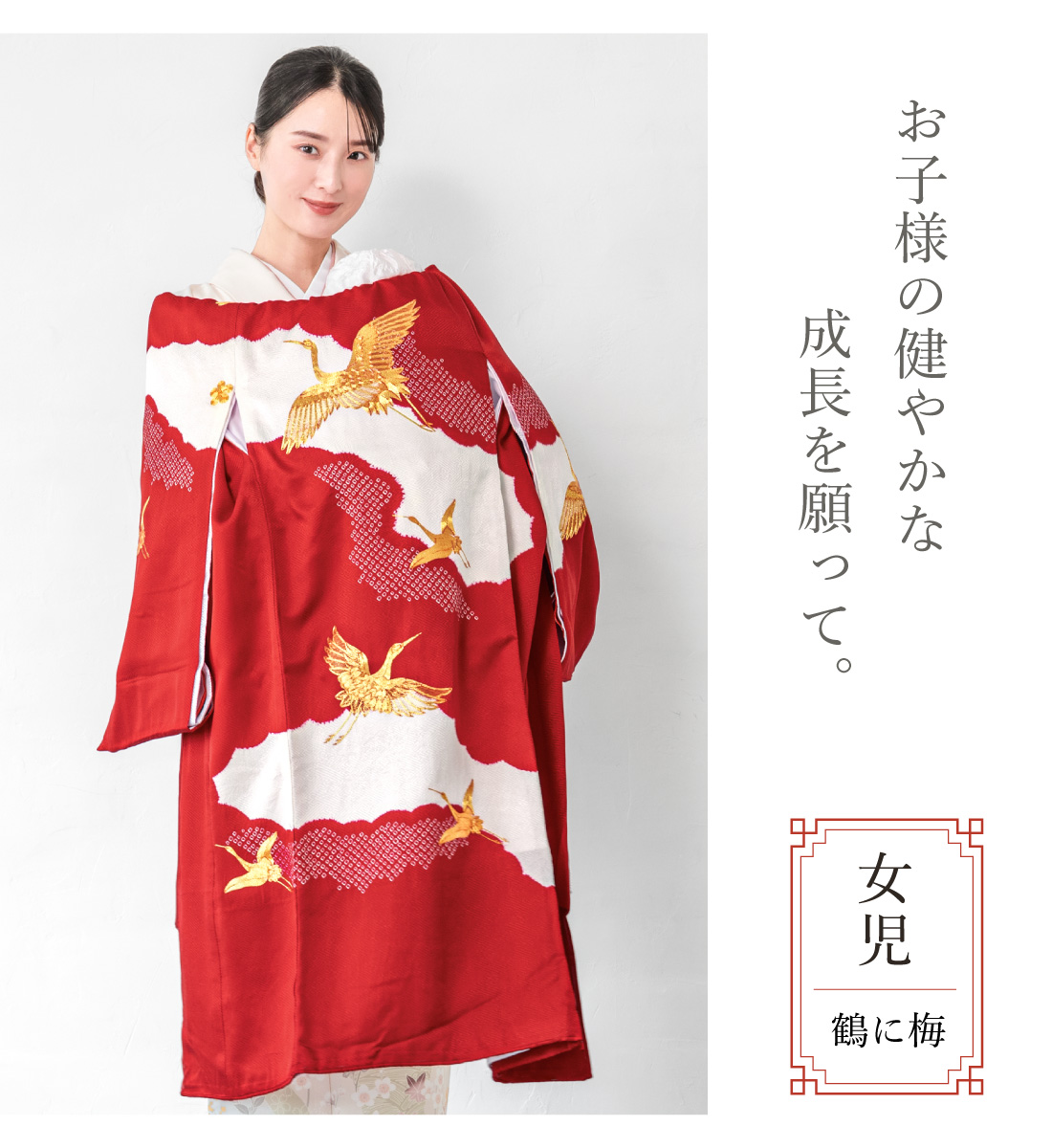 レンタル 産着 お宮参り 女の子 フルセット レッド 鶴 梅 金駒刺繍 掛け着 産着セット うぶぎ 祝着 子供着物 赤ちゃん 祝い着 帽子セット よだれかけ 創美苑