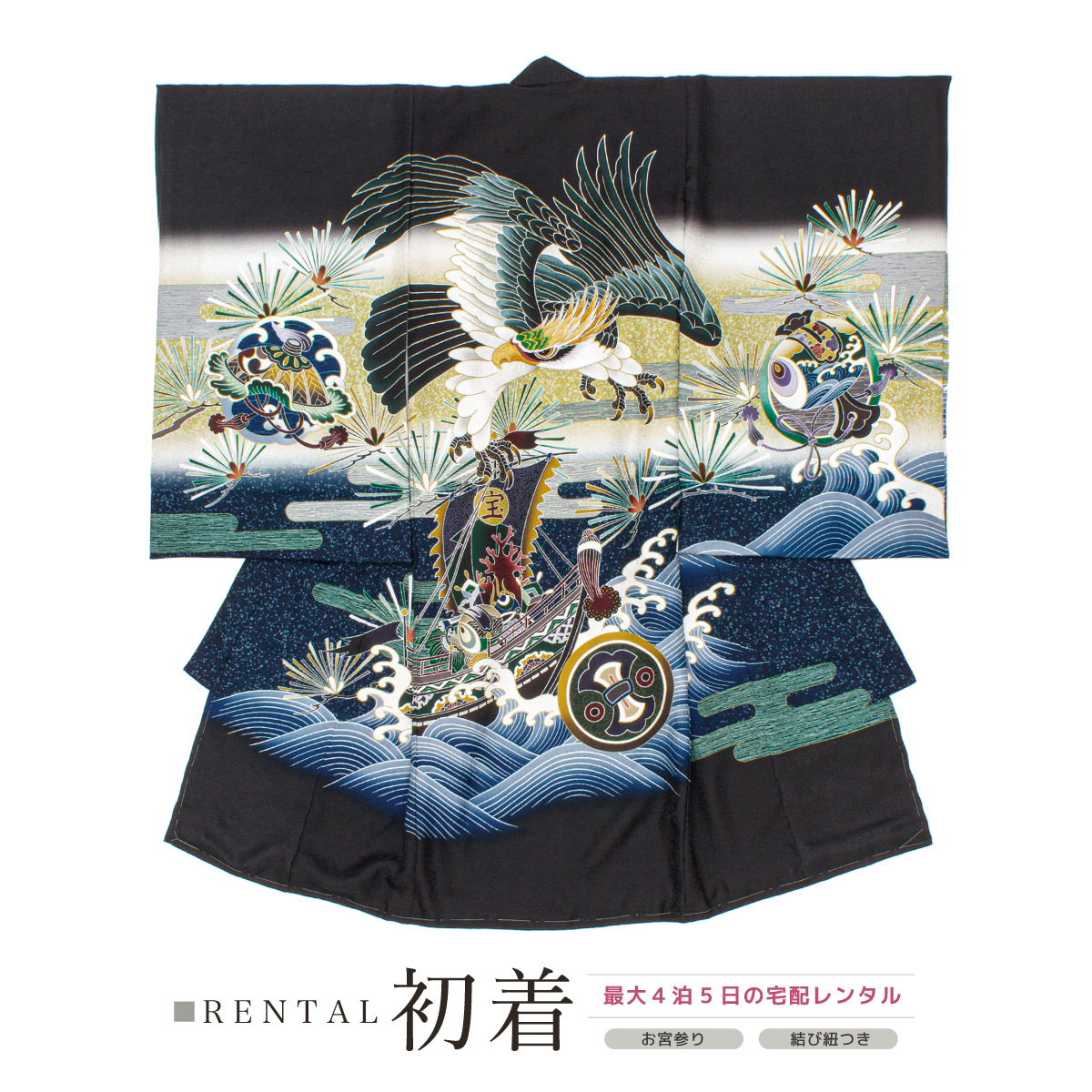 レンタル 産着 お宮参り 男の子 フルセット 鷹 宝船 ブラック 黒 掛け着 産着セット うぶぎ 祝着 子供着物 赤ちゃん 祝い着 帽子セット よだれかけ 創美苑