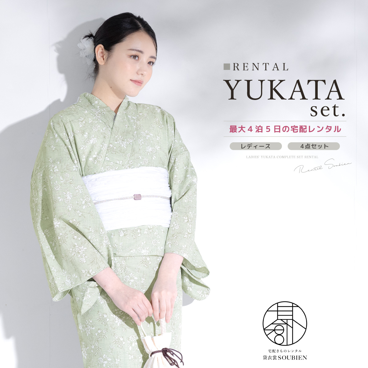 浴衣 セット レンタル レディース 浴衣セット 大人 簡単 涼しい ライトグリーン系 薄緑 小花柄 兵児帯 創美苑