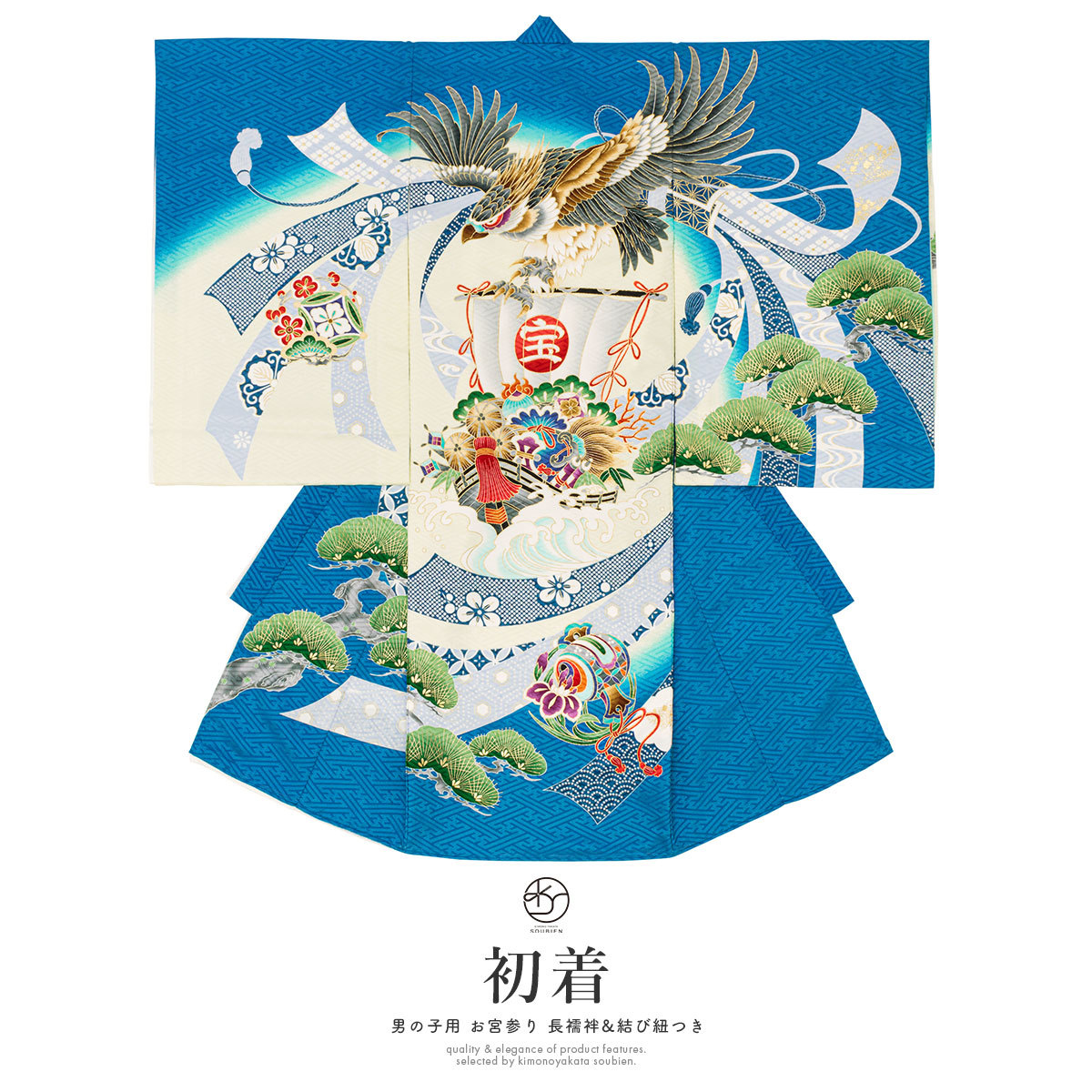 産着 男 男の子 販売 初着 青 ブルー 鷹 宝船 和柄 男児 掛け着 うぶぎ 祝着 お宮参り ポリエステル お祝い 赤ちゃん