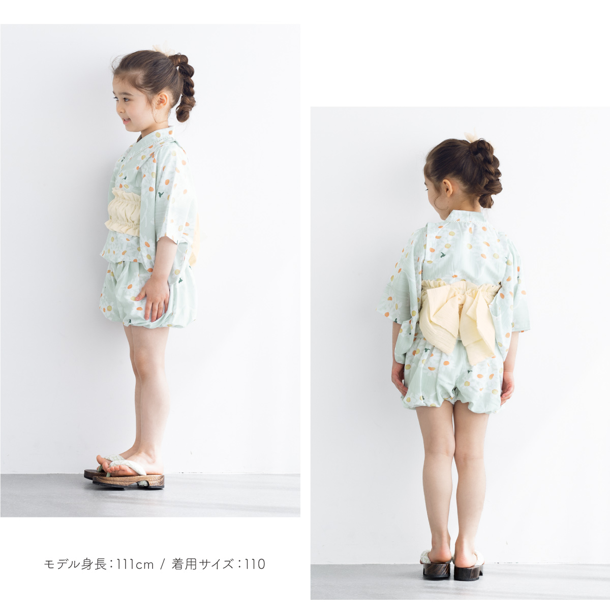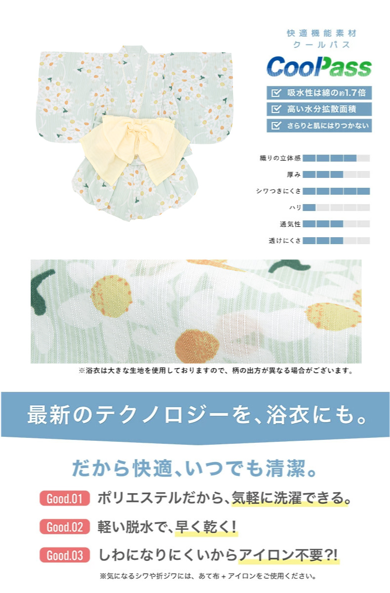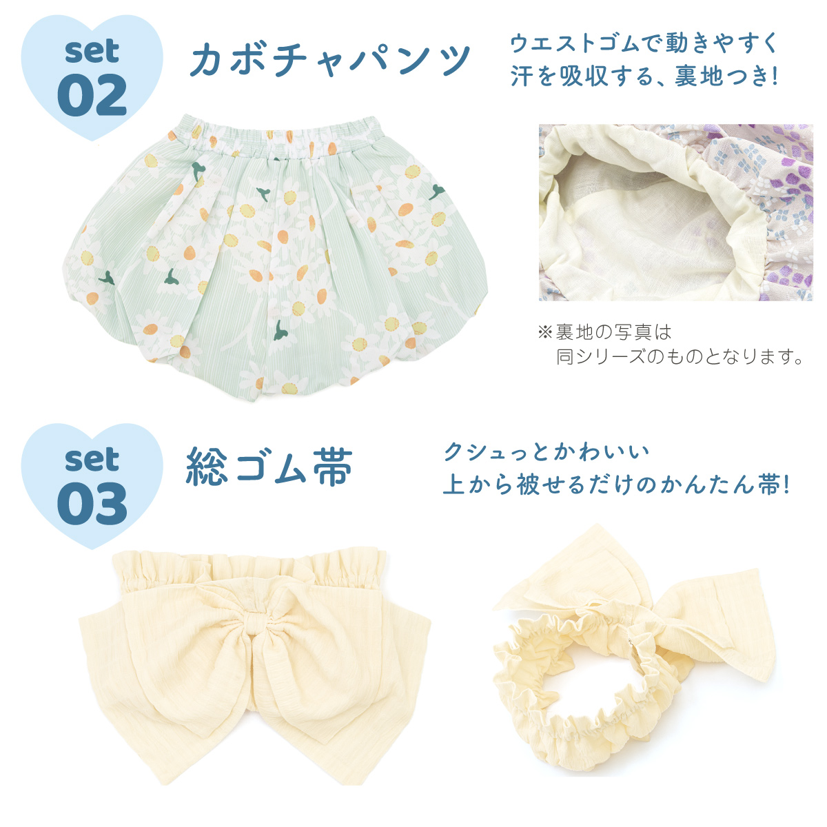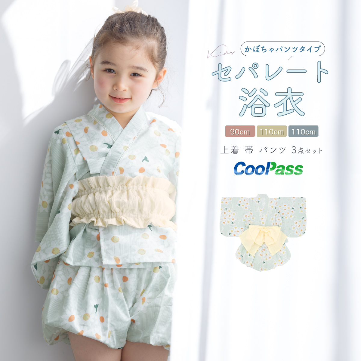 浴衣 子供 セパレート 女の子 ベビー 浴衣セット かぼちゃパンツ 帯 3点セット SOUBIEN 吸水速乾 白 緑 黄色 クリーム ガーベラ 90 100 110 送料無料 2025新作