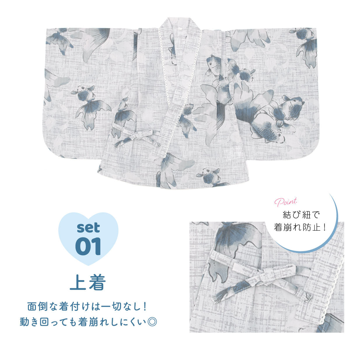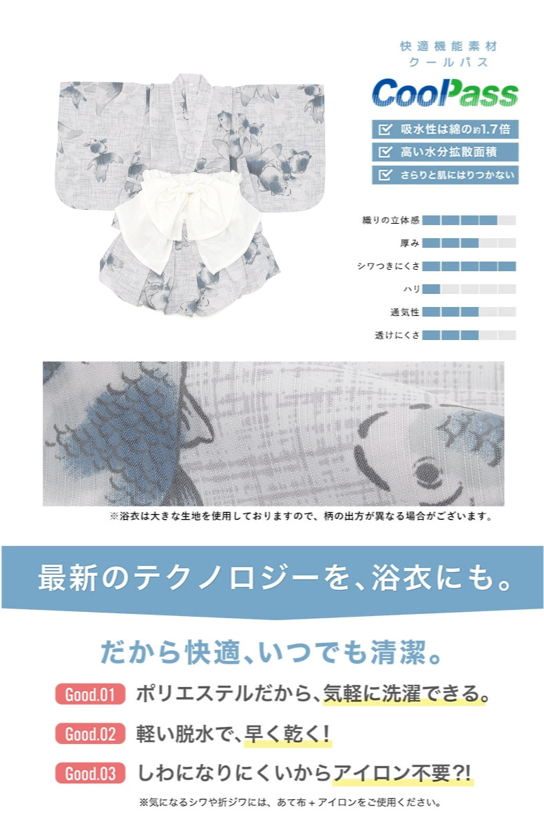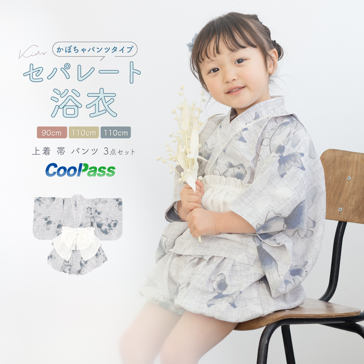 浴衣 子供 セパレート 女の子 ベビー 浴衣セット かぼちゃパンツ 帯 3点セット SOUBIEN 吸水速乾 青 グレー 白 金魚 90 100 110 送料無料 2025新作