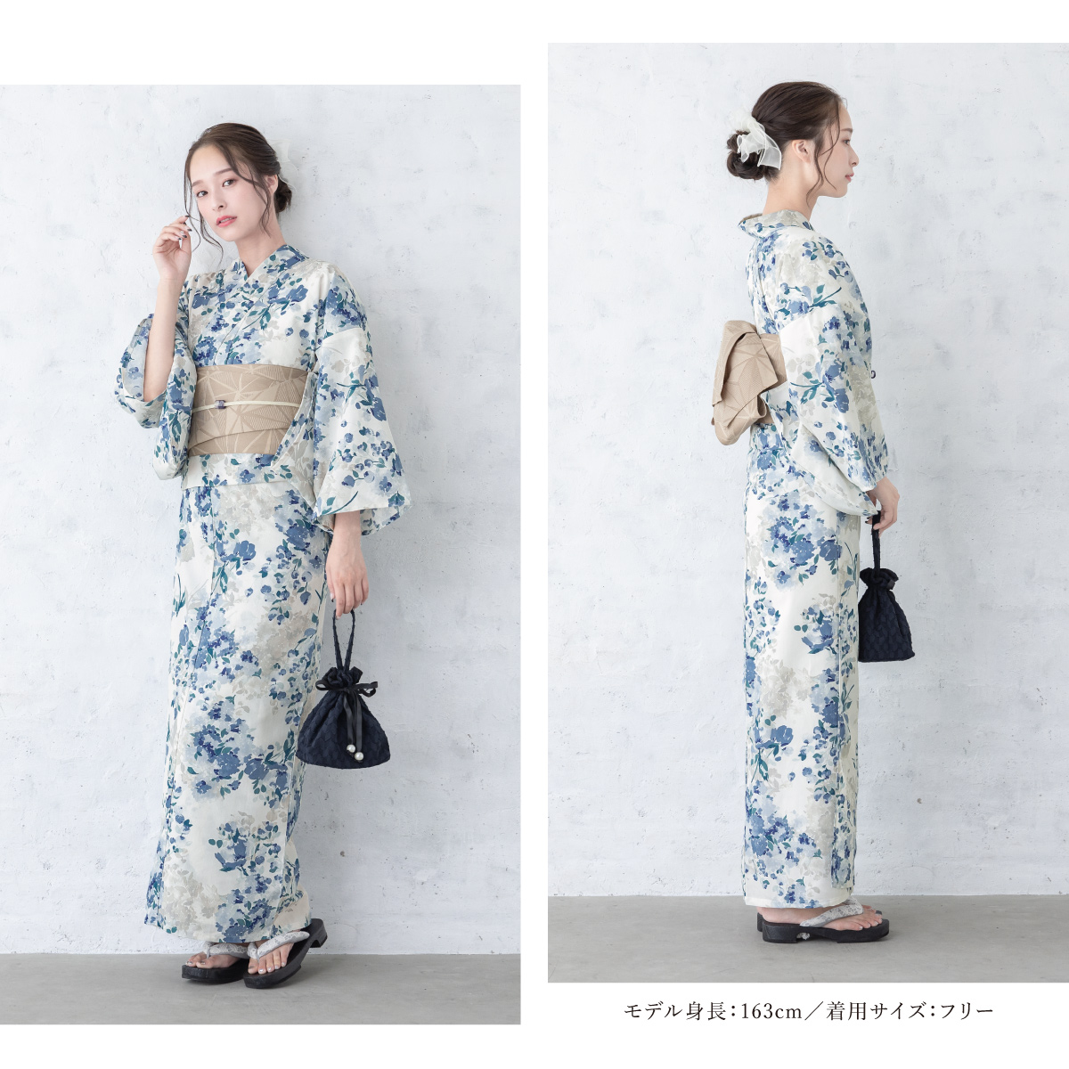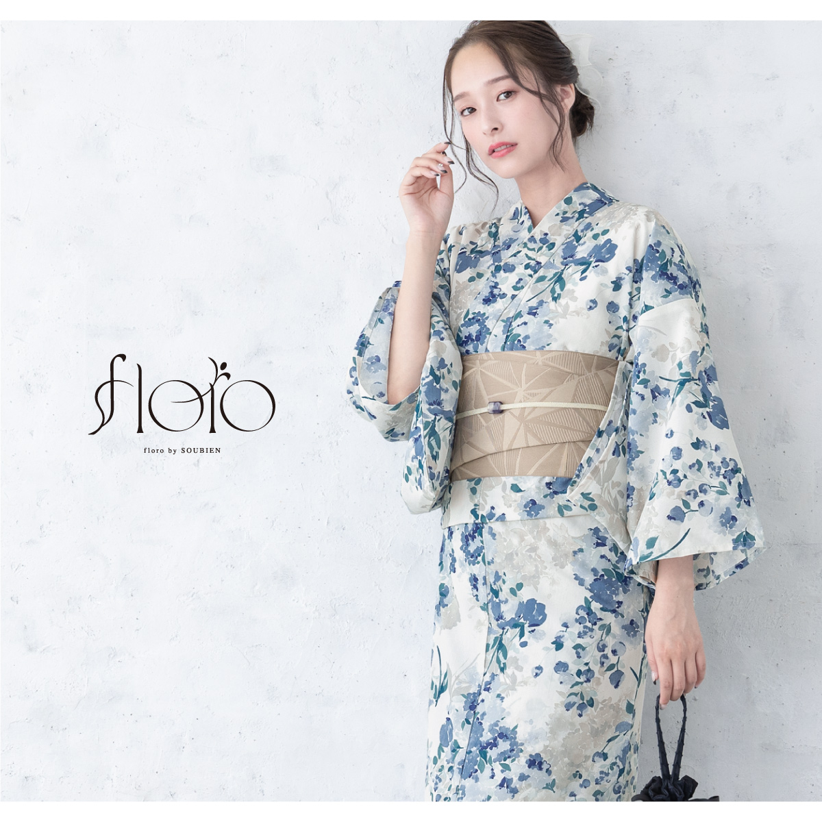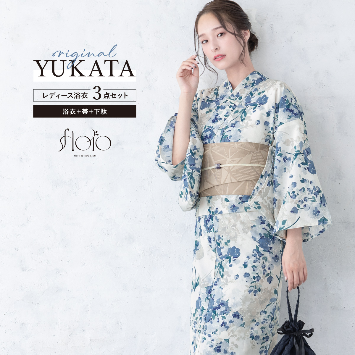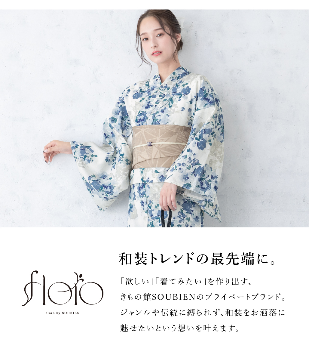 浴衣 レディース 浴衣セット 夏 大人 F 半幅帯 floro グレー 青 紺 ベージュ あじさい 花柄 レディース浴衣 女性 ゆかた ユカタ yukata モダン レトロ 創美苑